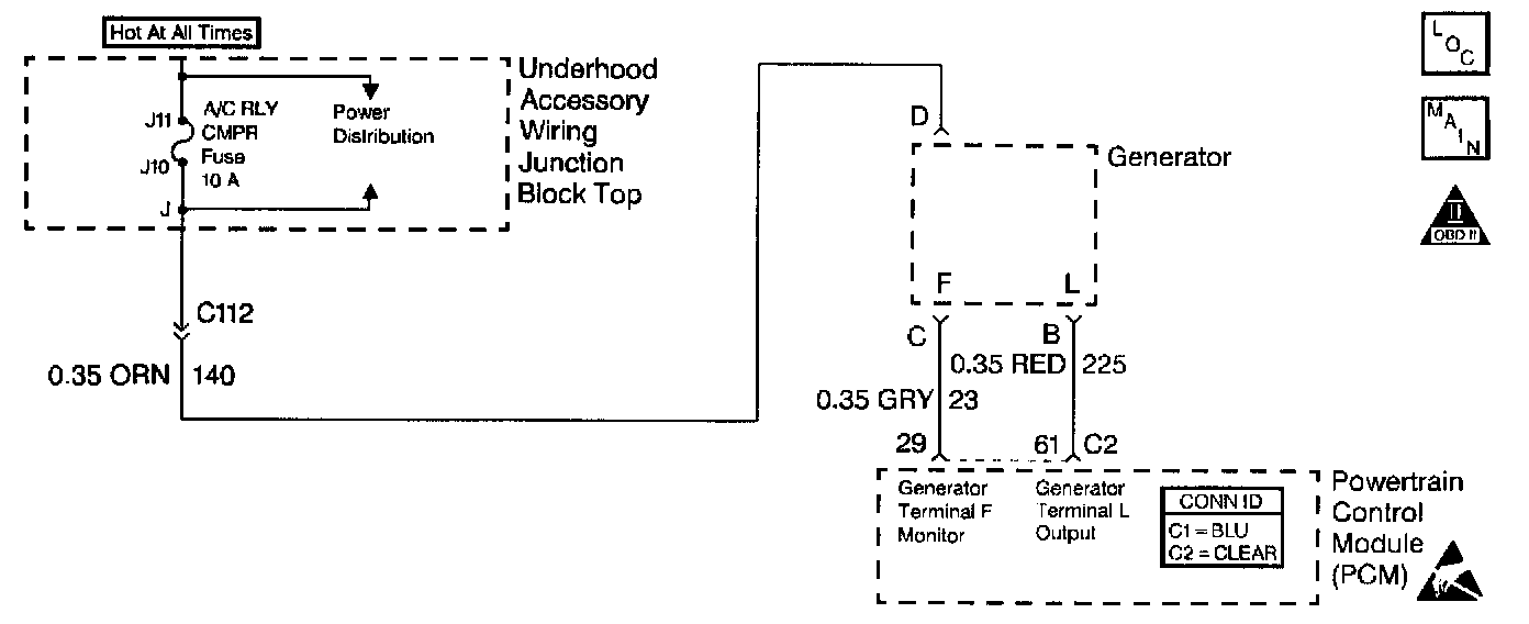 The PCM Input Field (F) terminal from the alternator provides a 400 Hz PWM signal to the PCM. The duty cycle of the F terminal mimics the duty cycle of the field coils in the alternator, Thus, the F terminal duty cycle indicates the relative electrical load on the alternator.