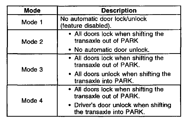 The four automatic door lock/unlock modes are described in the table below: