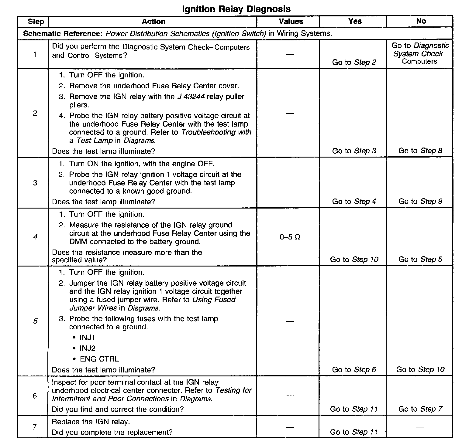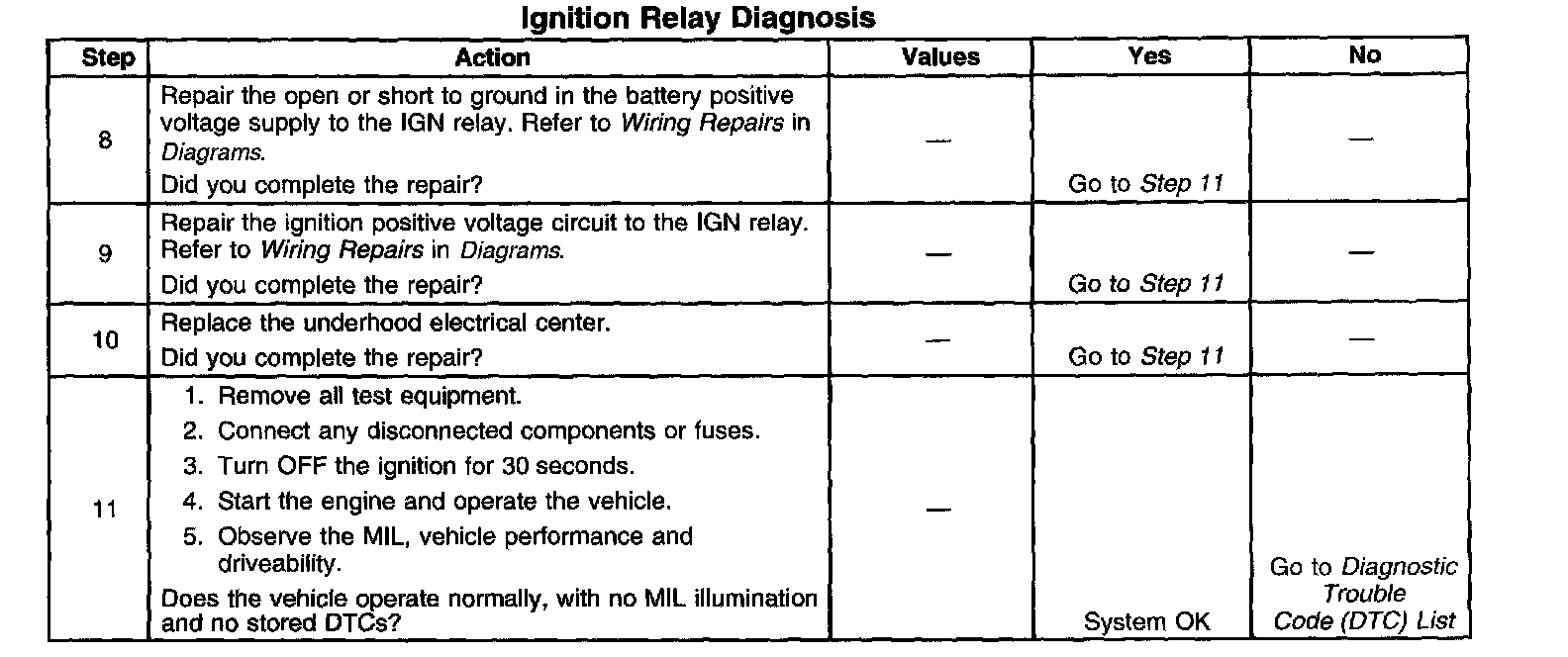 5. This step isolates the circuit from the IGN relay. All of the circuits at the relay are good if the test lamp illuminates.