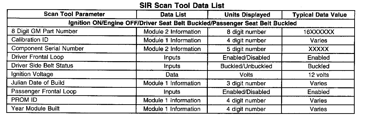 The SIR Scan Tool Data List contains all the restraint system related parameters that are available on the scan tool. The parameters in the list are arranged in alphabetical order. The column, "Data List," indicates the location of the parameter within the scan tool menu selections.