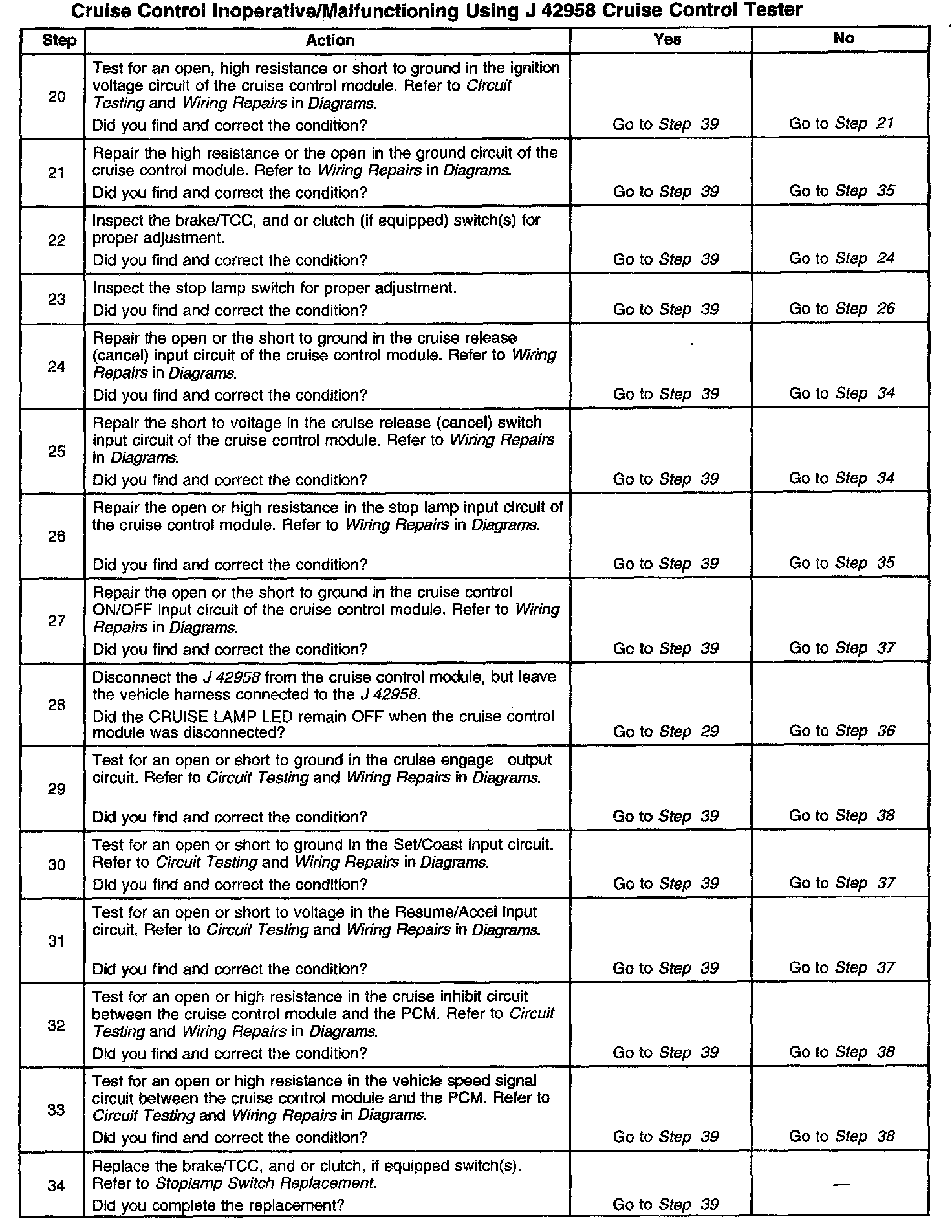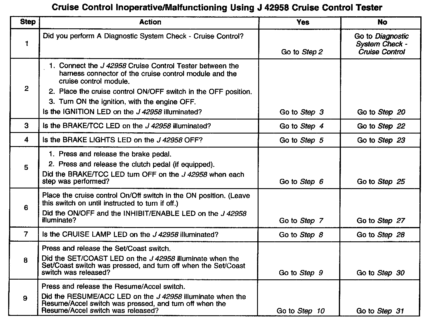 It has been found that when this Tester is used on some vehicles with high resistance or an open in the cruise control module ground circuit, the Tester's LED(s) will light abnormally. For example, the Brake/Clutch and VSS LED(s) will light normally but the Ignition LED will be dim with the ON/OFF switch in the OFF position. However, with the ON/OFF switch in the ON position only the VSS LED will light. If you come upon the above situation, please check the ground circuit prior to going on with your diagnosis.