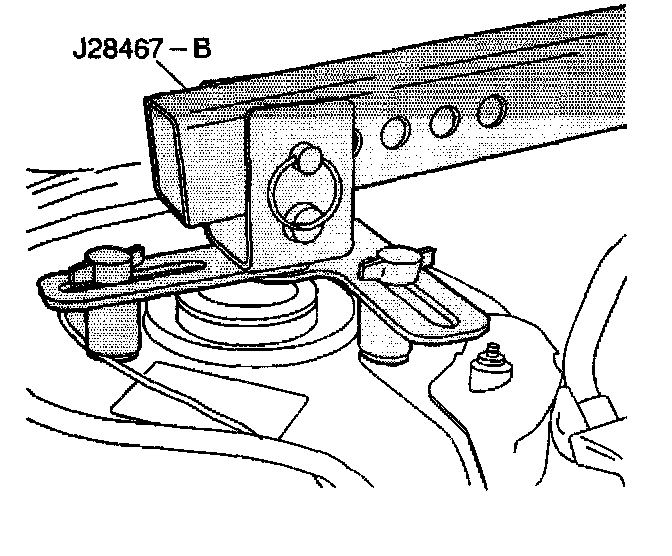 16. Adjust the radiator shelf tube (J28467-2A) and the assemblage lift hook bracket (J28467-6A) in order to align the hook with the left (front), rear of engine, lift hook bracket part of the left engine mount strut bracket.