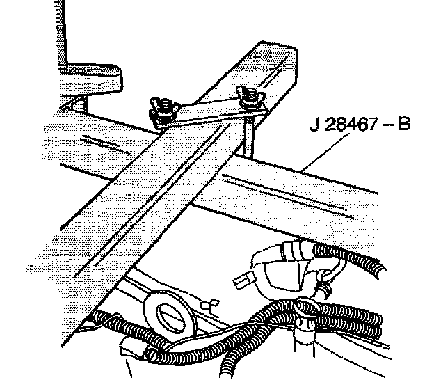 20. Place the rubber padded foot of the front support assembly (J28467-4A) on the vehicle radiator shelf. The foot position used in the front support assembly (J28467-4A) depends on the vehicle application.
