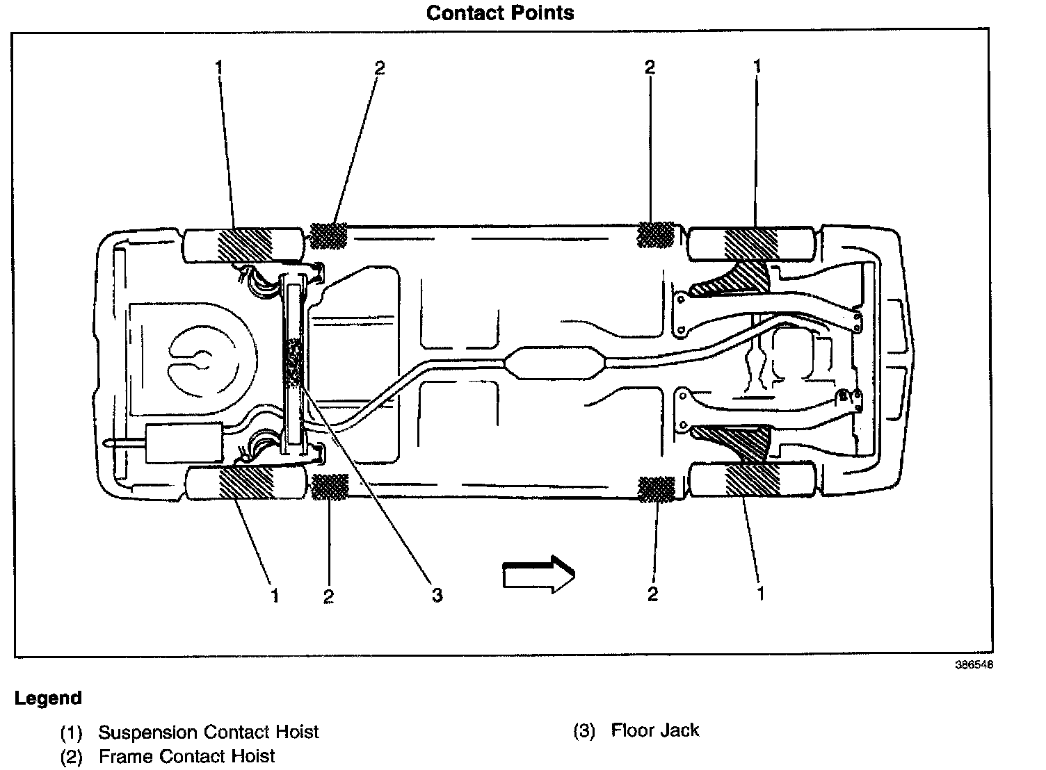^ To avoid any vehicle damage, serious personal injury or death when major components are removed from the vehicle and the vehicle is supported by a hoist, support the vehicle with jack stands at the opposite end from which the components are being removed.