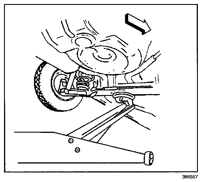 IMPORTANT: The floor jack pad must not be placed under the (rear suspension crossmember) front reinforcement rib.