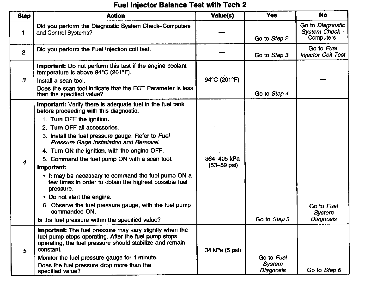 5. The fuel pressure should reach a steady value. Refer to Fuel System Diagnosis if the fuel pressure does not stabilize. Component Tests and General Diagnostics