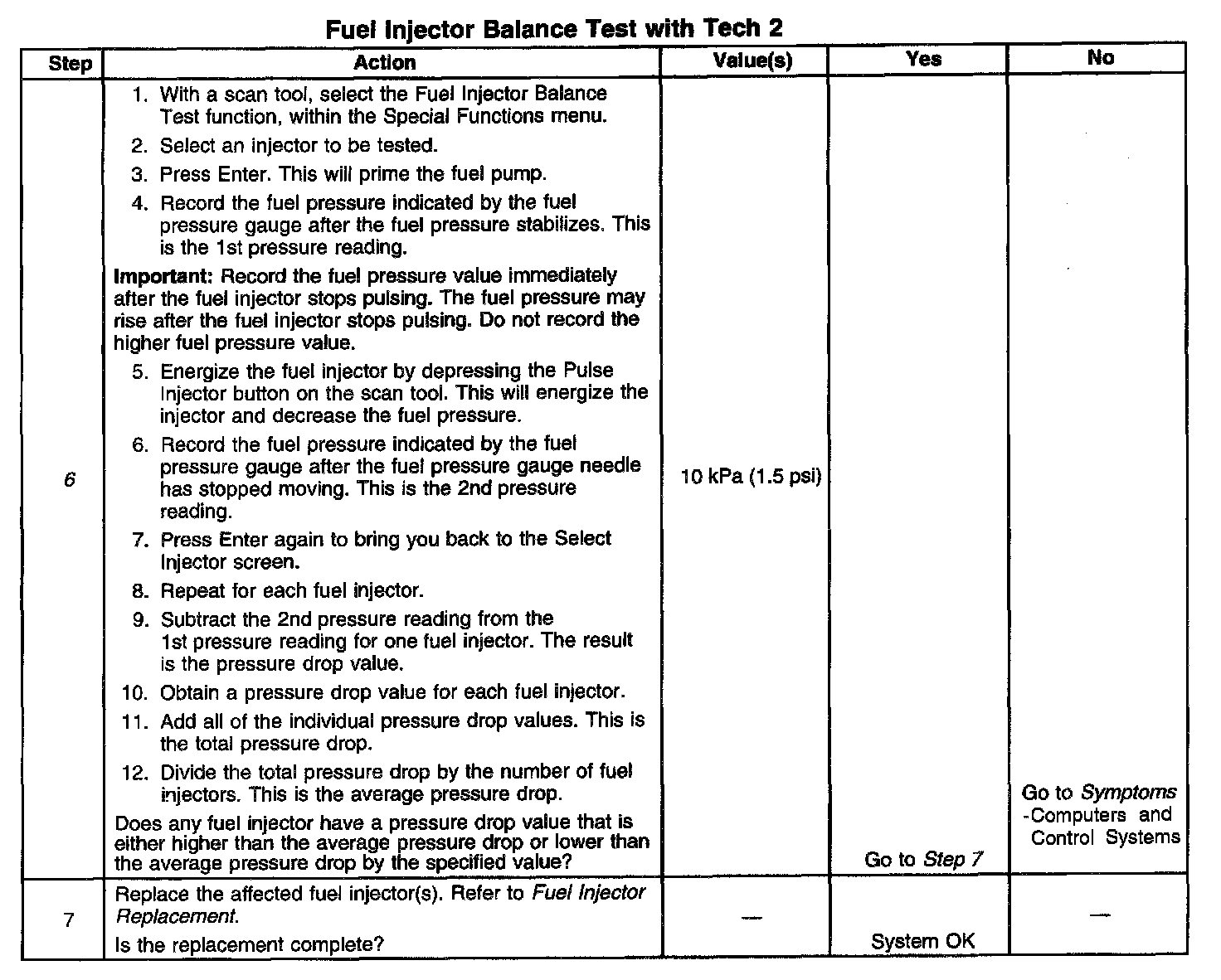 6. If the pressure drop value for each fuel injector is within 10 kPa (1.5 psi) of the average pressure drop value, the fuel injectors are flowing properly. Calculate the pressure drop value for each fuel injector by subtracting the second pressure reading from the first pressure reading.