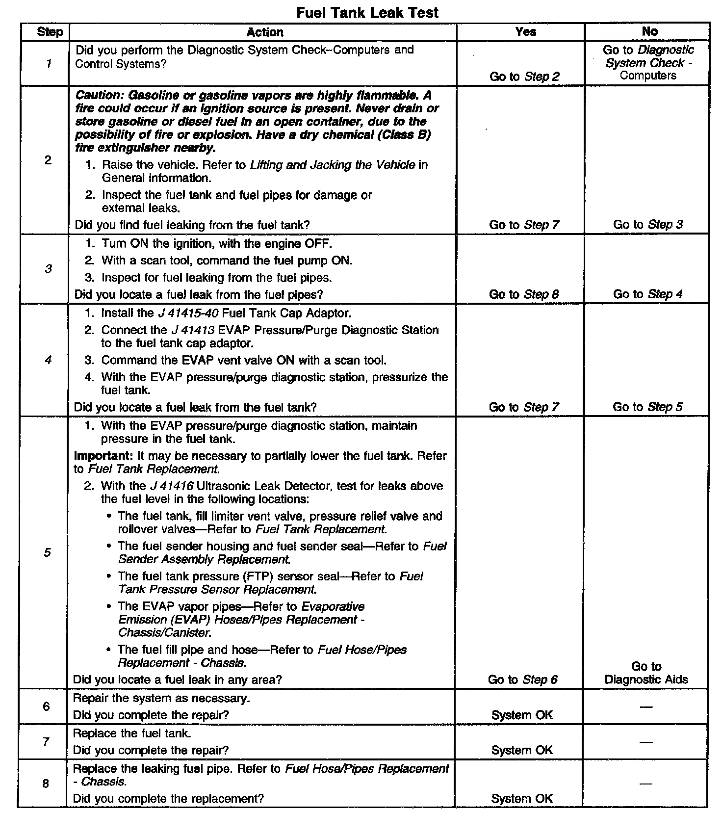 DESCRIPTIONThe fuel tank leak test is used to locate any fuel or fuel vapor escaping the fuel tank area. Fuel vapors escaping above the fuel level will be detected when the Evaporative Emission (EVAP) leak diagnostic completes one test cycle. The MIL will illuminate after the EVAP leak diagnostic complete two test cycles.