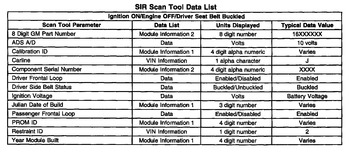 Use the SIR Scan Tool Data List as directed by a diagnostic table or in order to supplement the diagnostic procedures. Begin all of the diagnostic procedures with the SIR Diagnostic System Check. Use the SIR Scan Tool Data List after the following is determined: