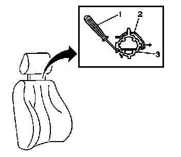 3. Push the J 42214 (1) toward the right side of the seat in order to release the retaining clip (2) from notch in the head restraint post.
