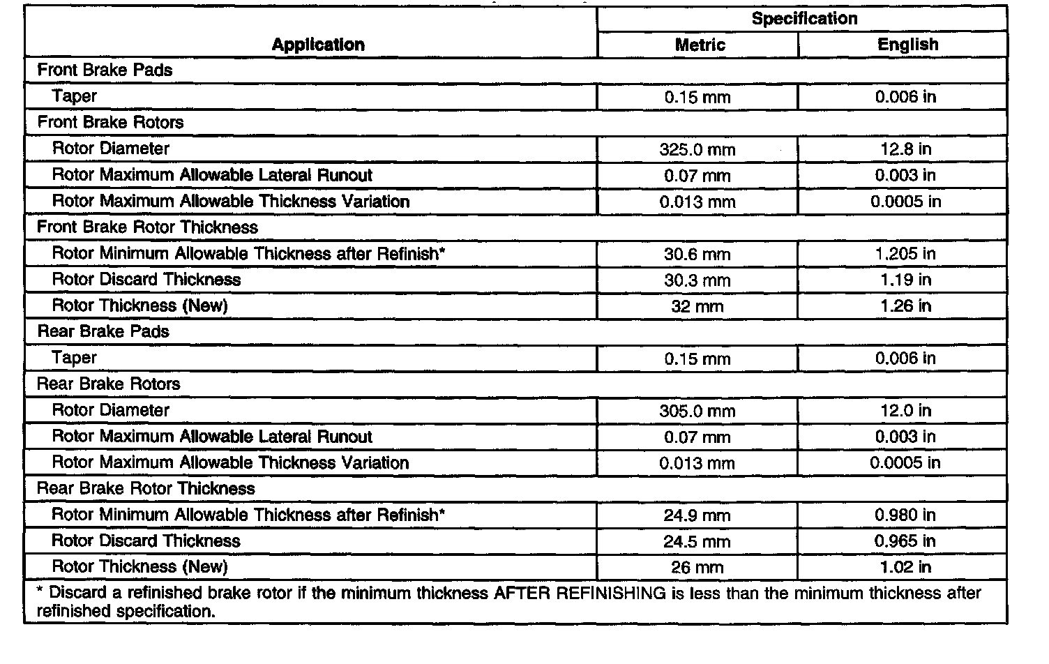 Disc Brake Component Specifications