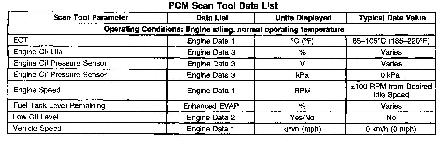Scan Tool Data List - Powertrain Control Module (PCM)