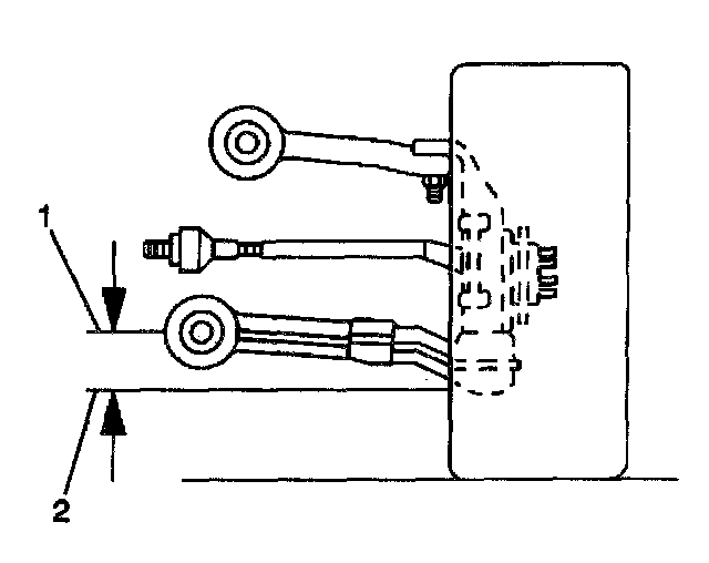 4. Use the J 42854 in order to measure the distance between the lowest point of the ball joint (2) and the center of the front side of the lower control amp mounting bolt (1).