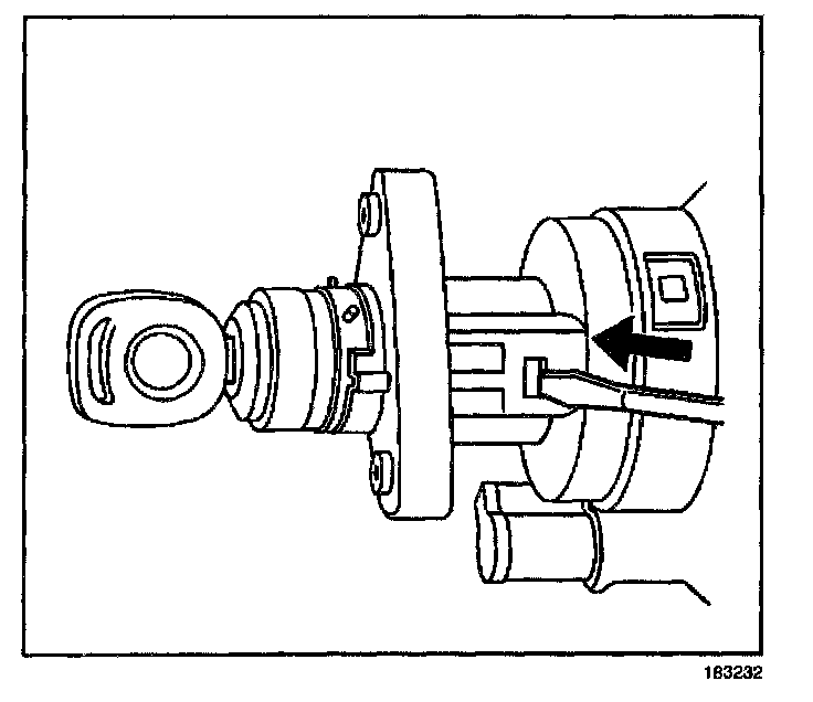 9. Using a flat bladed screwdriver or other suitable tool, depress and hold the ignition lock cylinder retaining tab (located on the RH lower side of the ignition switch)