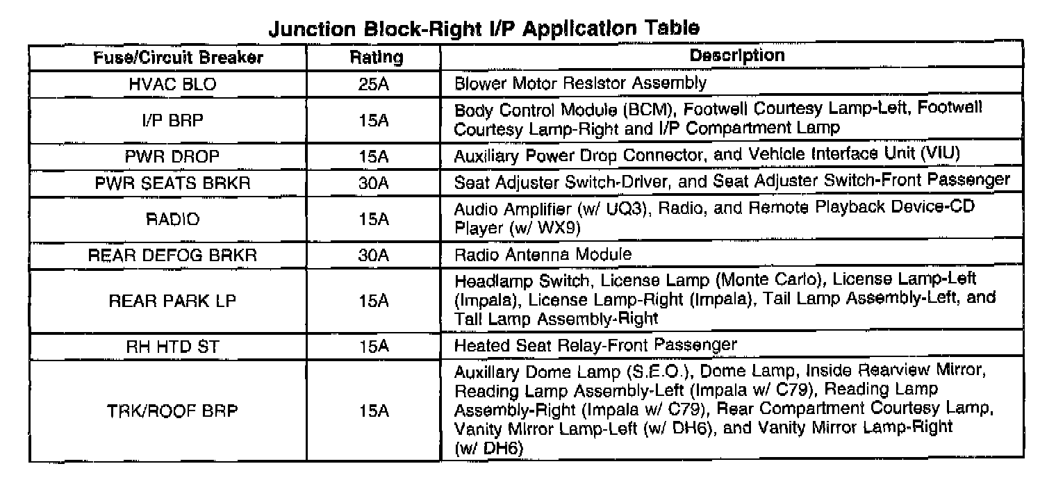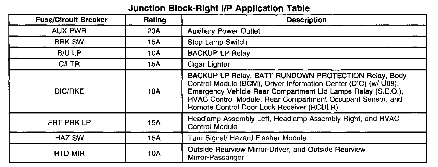 Junction Block-Right I/P Application Table (Part 2 Of 2):