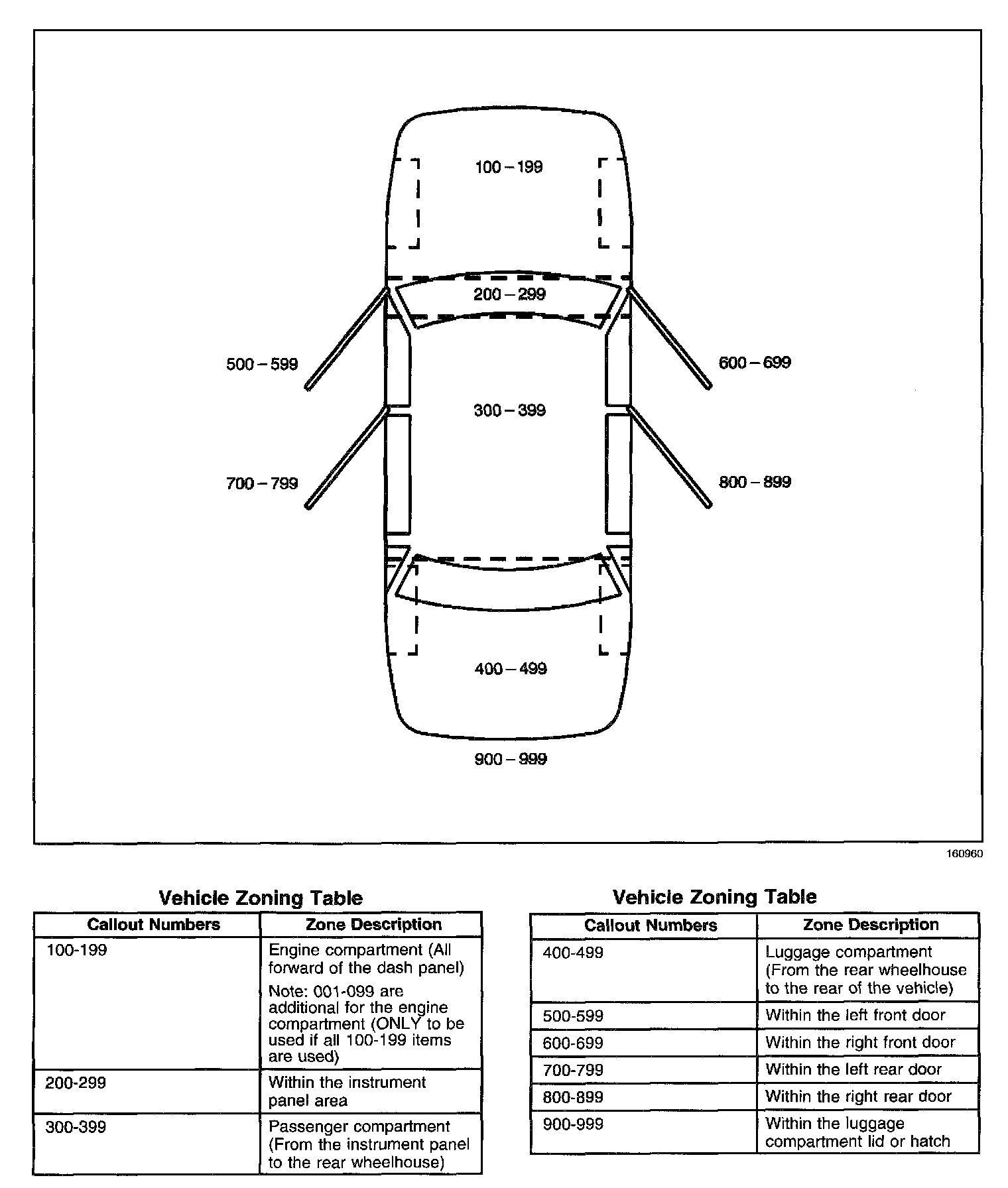 All grounds, in-line connectors, pass-through grommets, and splices have identifying numbers that correspond to where they are located in the vehicle. The table explains the numbering system.
