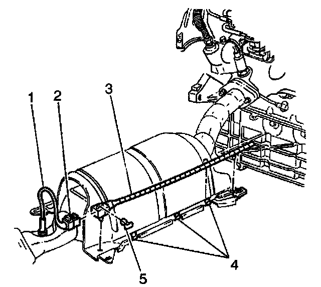 4. Remove the heated oxygen sensor (H02S) wiring harness (3) from the catalytic converter heat shield (4).