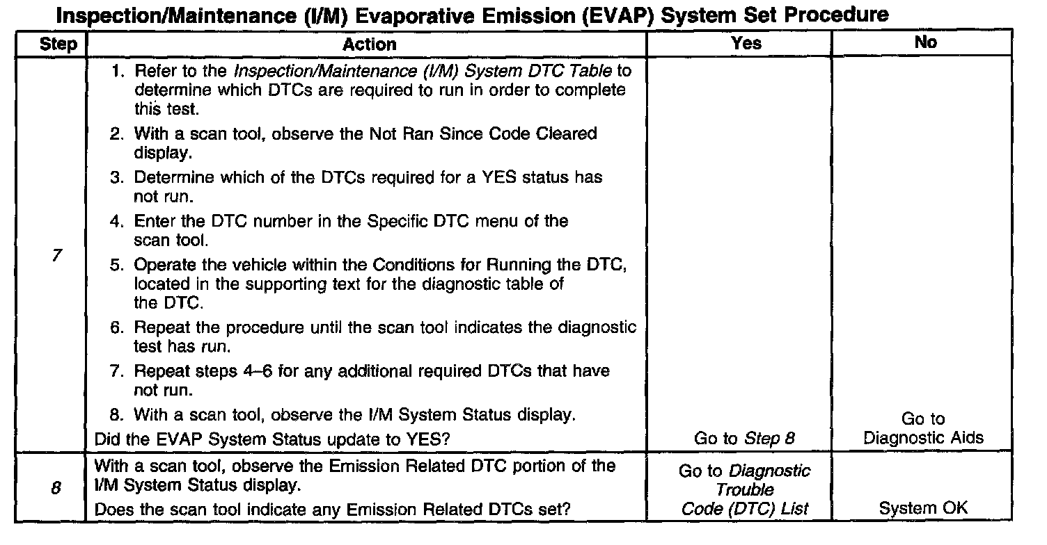 8. The I/M System Status only reports on whether or not a diagnostic has run, not the outcome of the test. If any emission related DTC sets after the tests are complete, the DTC will require diagnosis.