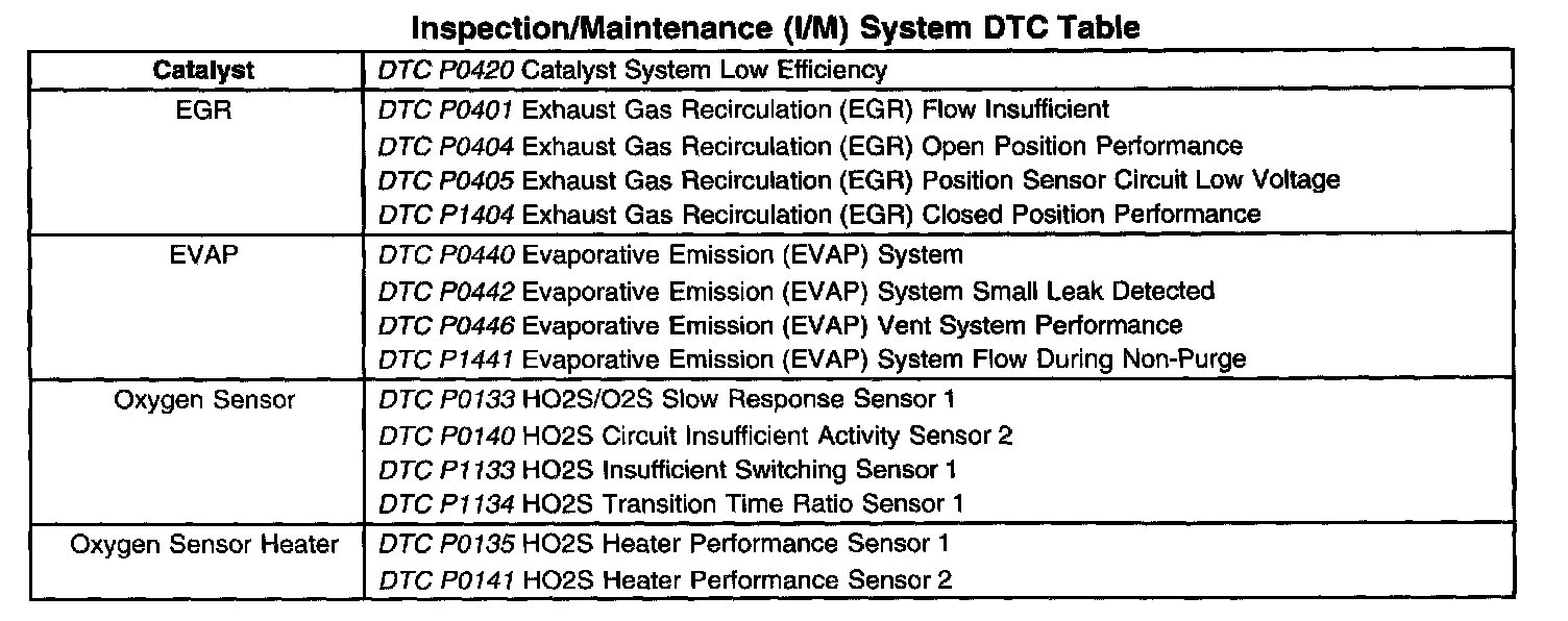 Inspection/Maintenance (I/M) System DTC Table: