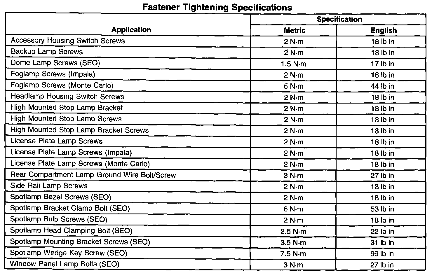 Fastener Tightening Specifications: