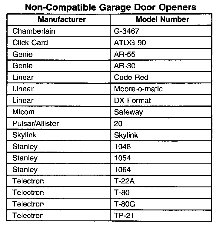 Non Compatible Garage Door Openers: