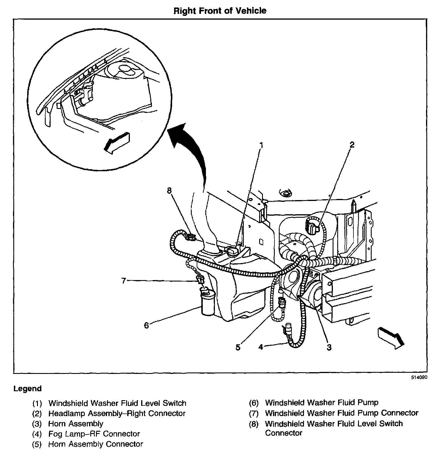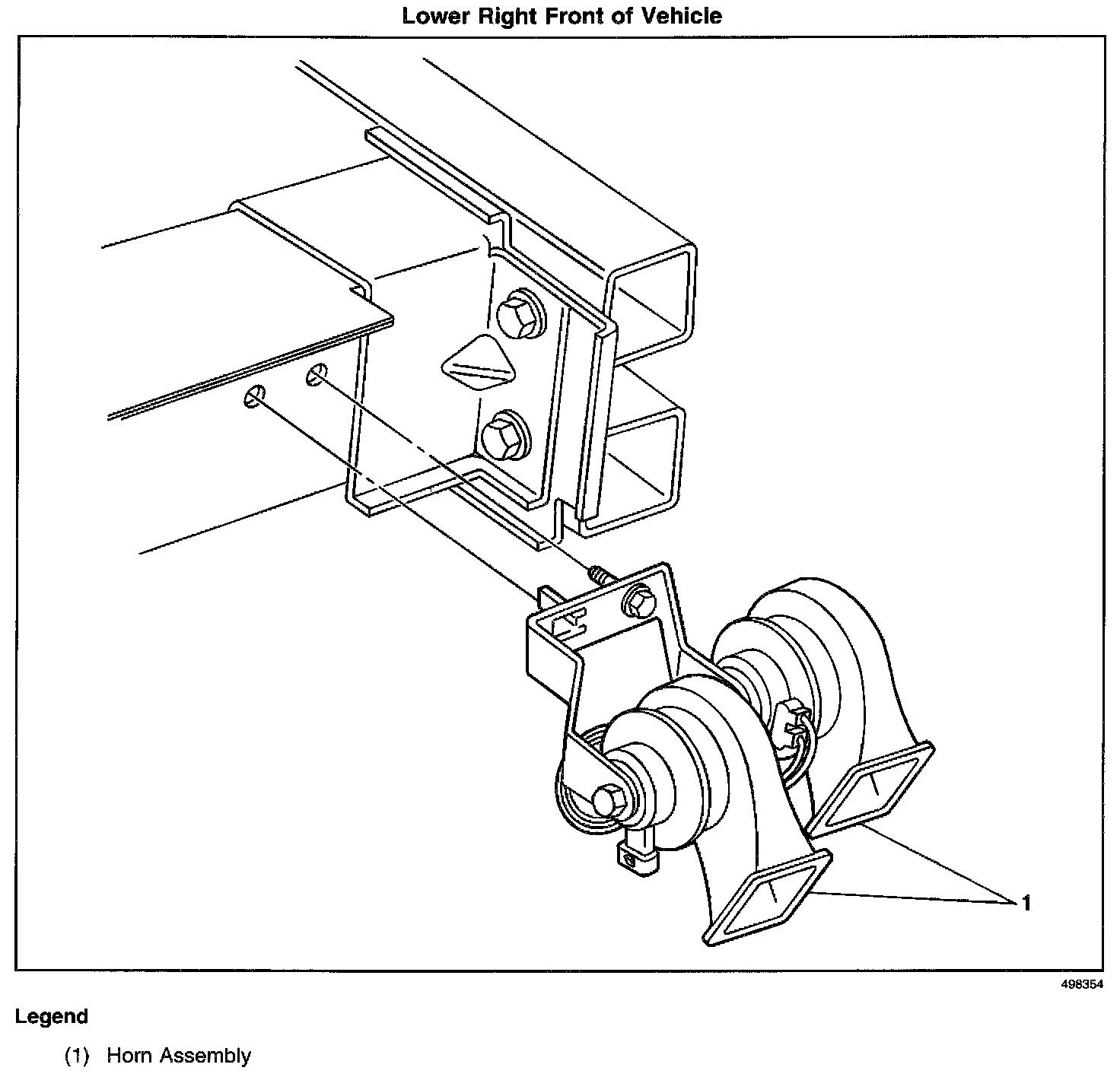 Front of the vehicle, below the right headlamp assembly, outside of the right frame rail