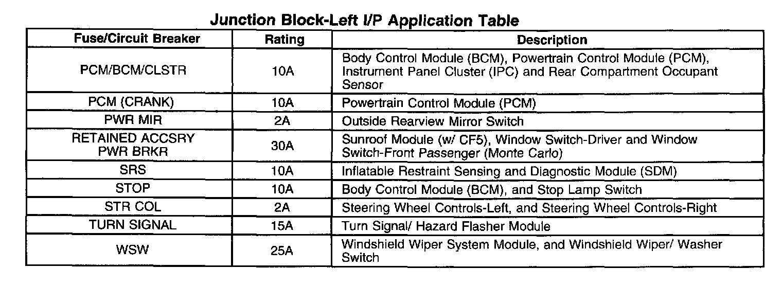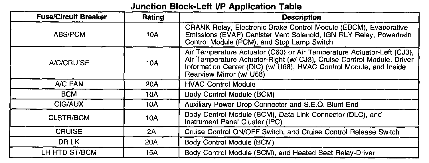 Junction Block-Left I/P Application Table (Part 1 Of 2):