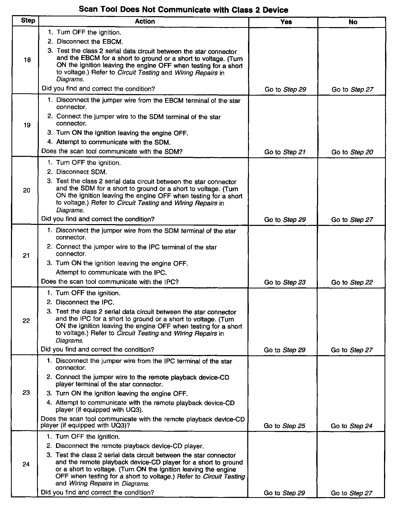 9. The class 2 serial data circuit is shorted to voltage or ground. The condition may be due to the wiring or due to a malfunction in one of the modules. When testing the wire for a short, make sure there is not a module connected to the wire being tested. This test isolates the BCM class 2 serial data circuit.