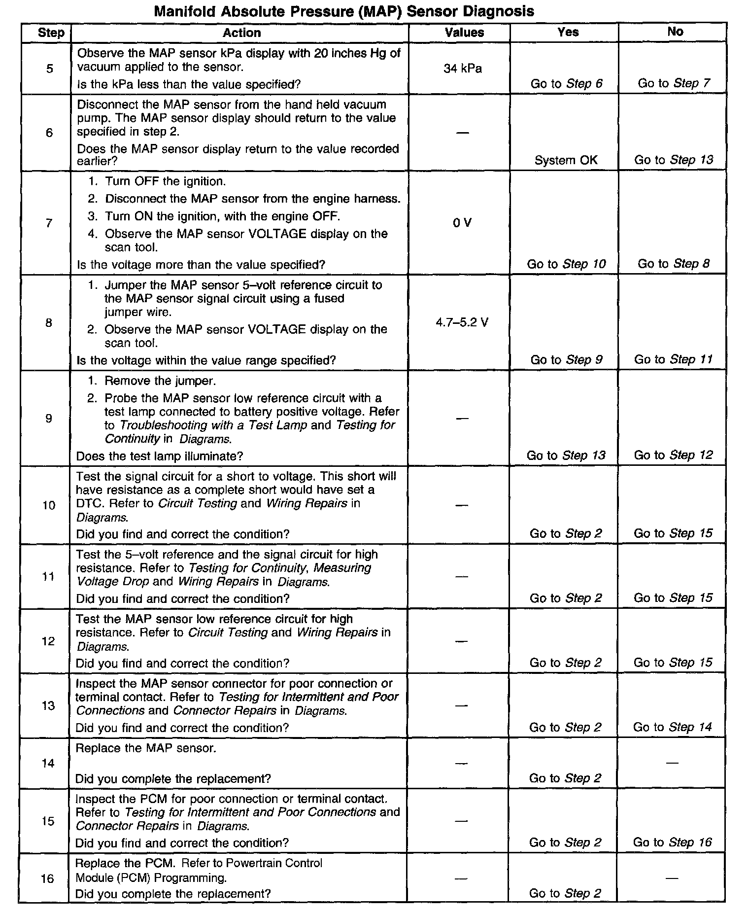 CIRCUIT DESCRIPTIONThe Manifold Absolute Pressure (MAP) sensor responds to pressure changes in the intake manifold which gives an indication of the engine load. The MAP sensor has a 5-volt reference circuit, a low reference circuit, and a signal circuit. The Powertrain Control Module (PCM) supplies 5 volts to the MAP sensor on the 5-volt reference circuit and provides a ground on the low reference circuit. The MAP sensor provides a signal to the PCM on the signal circuit which is relative to the pressure changes in the manifold. With low manifold absolute pressure such as during idle or deceleration, the PCM should detect a low signal voltage. With high manifold absolute pressure such as ignition ON, with the engine OFF or wide-open throttle, the PCM should detect a high signal voltage. Certain vehicle models will also use the MAP sensor in order to calculate the Barometric Pressure (BARO) when the ignition switch is turned ON, with the engine OFF. The BARO reading may also be updated whenever the engine is operated at wide-open throttle. The PCM monitors the MAP sensor signal for voltage outside of the normal range. If the PCM detects a MAP sensor signal voltage that is excessively high, DTC P0108 will set. IP the PCM detects a MAP sensor signal voltage that is excessively low, DTC P0107 will set.