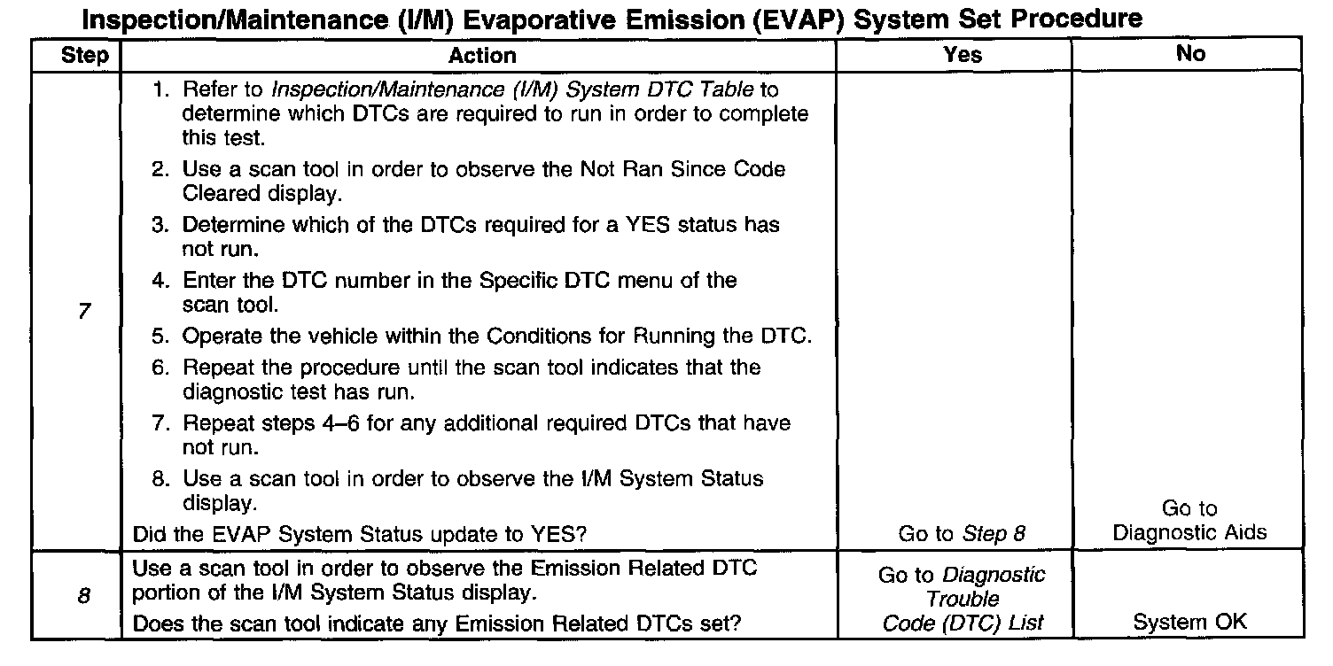 6. This step is to identify a first failure of a type B DTC. A DTC only appears on the I/M System Status display when the DTC becomes a MIL illuminating DTC. This occurs on the second failure of a type B DTC. A first failure of a type B DTC will not allow the I/M System Status to update to YES. Refer to Diagnostic Aids.