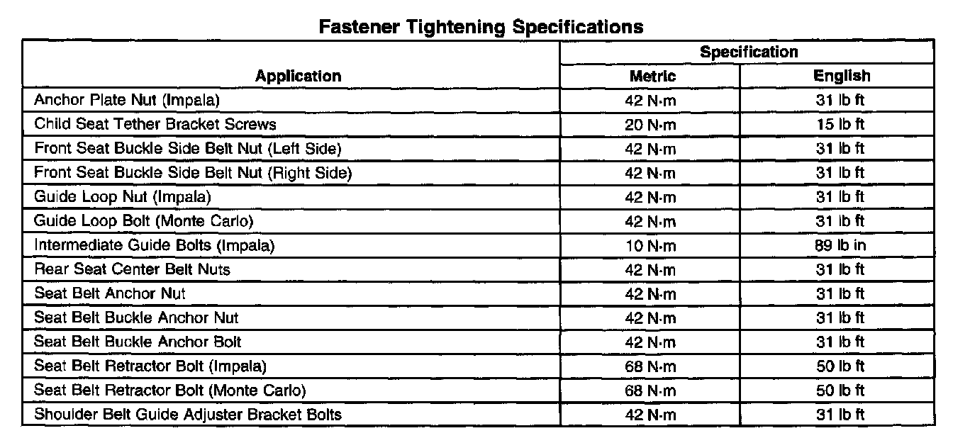 Fastener Tightening Specifications: