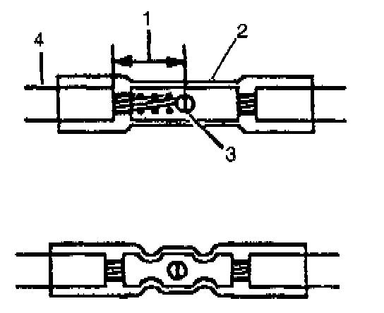 9. Insert the wires into the splice sleeve until the wire hits the barrel stop. The splice sleeve has a stop in the middle of the barrel in order to prevent the wire from passing through the splice (3).