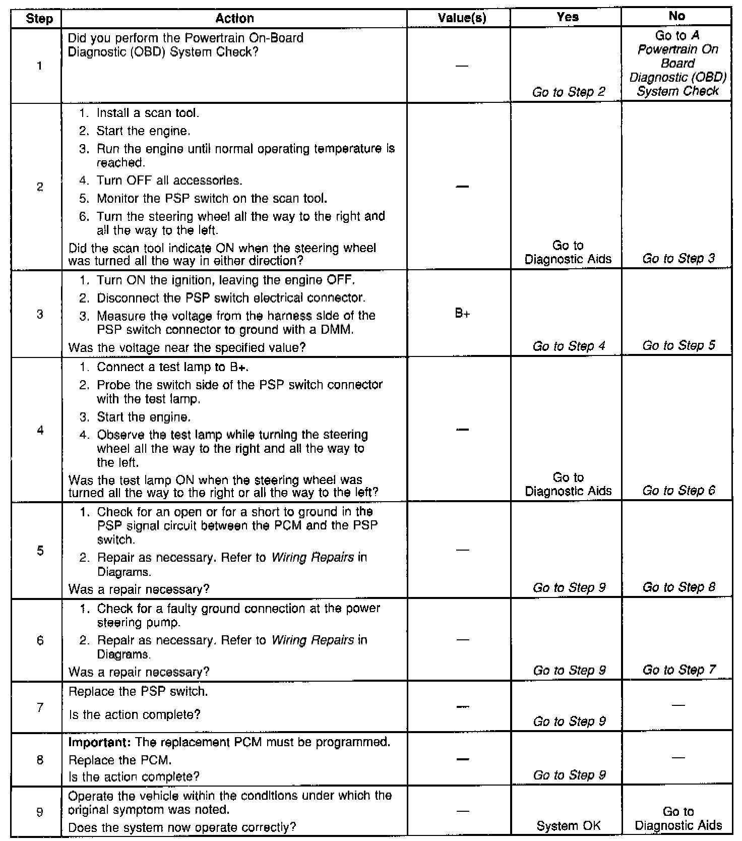4. This step checks for a poor ground connection at the power steering pump or for a faulty PSP switch.