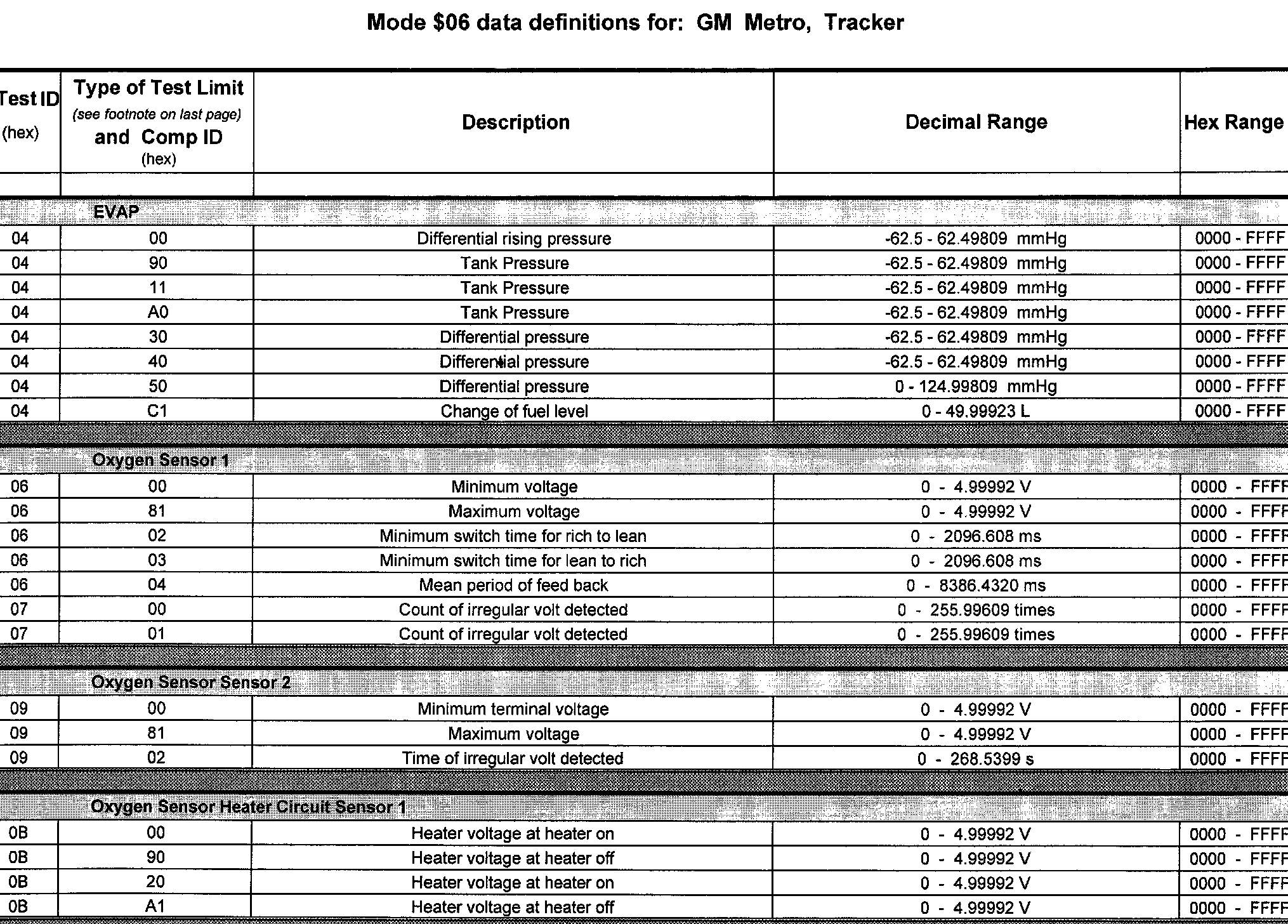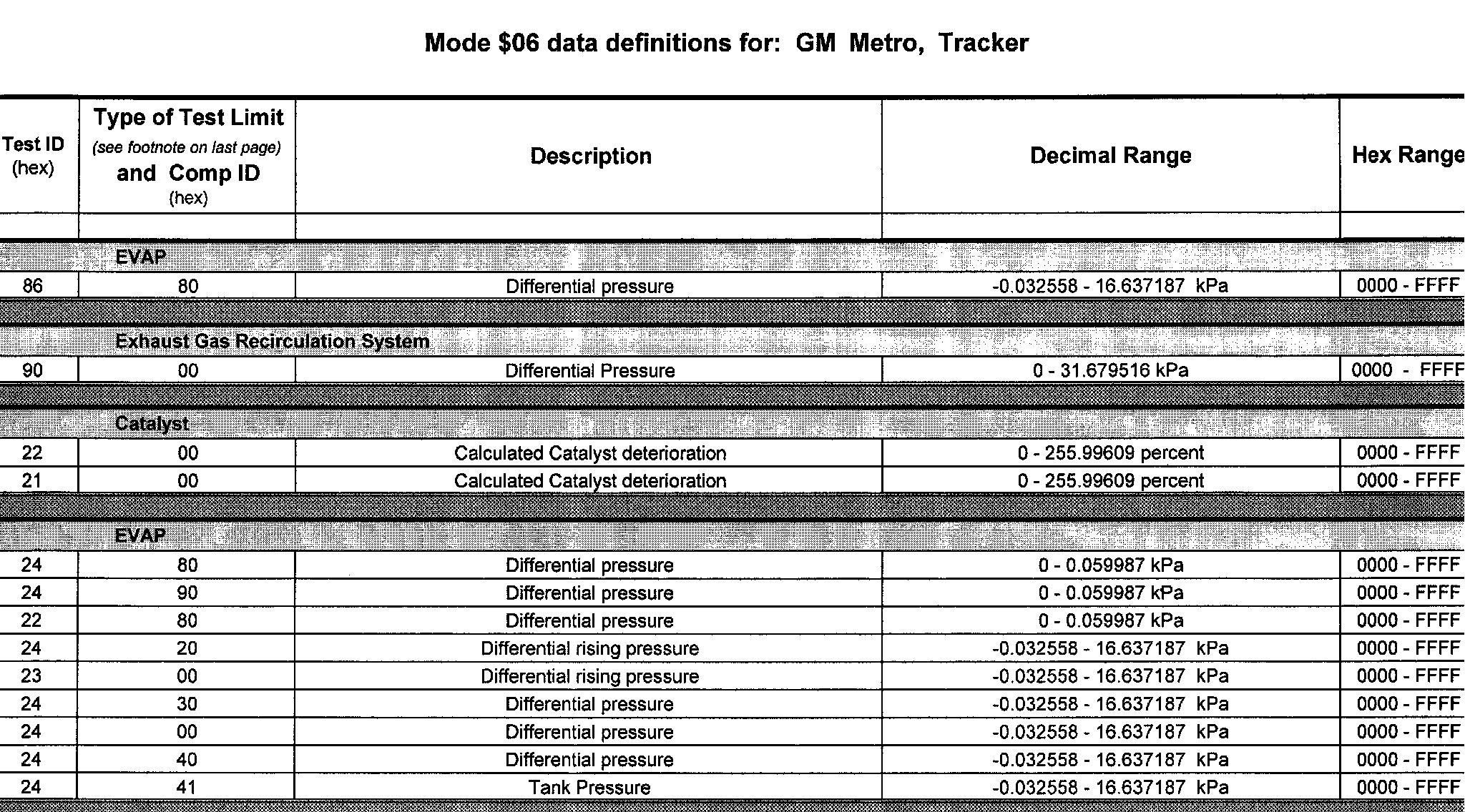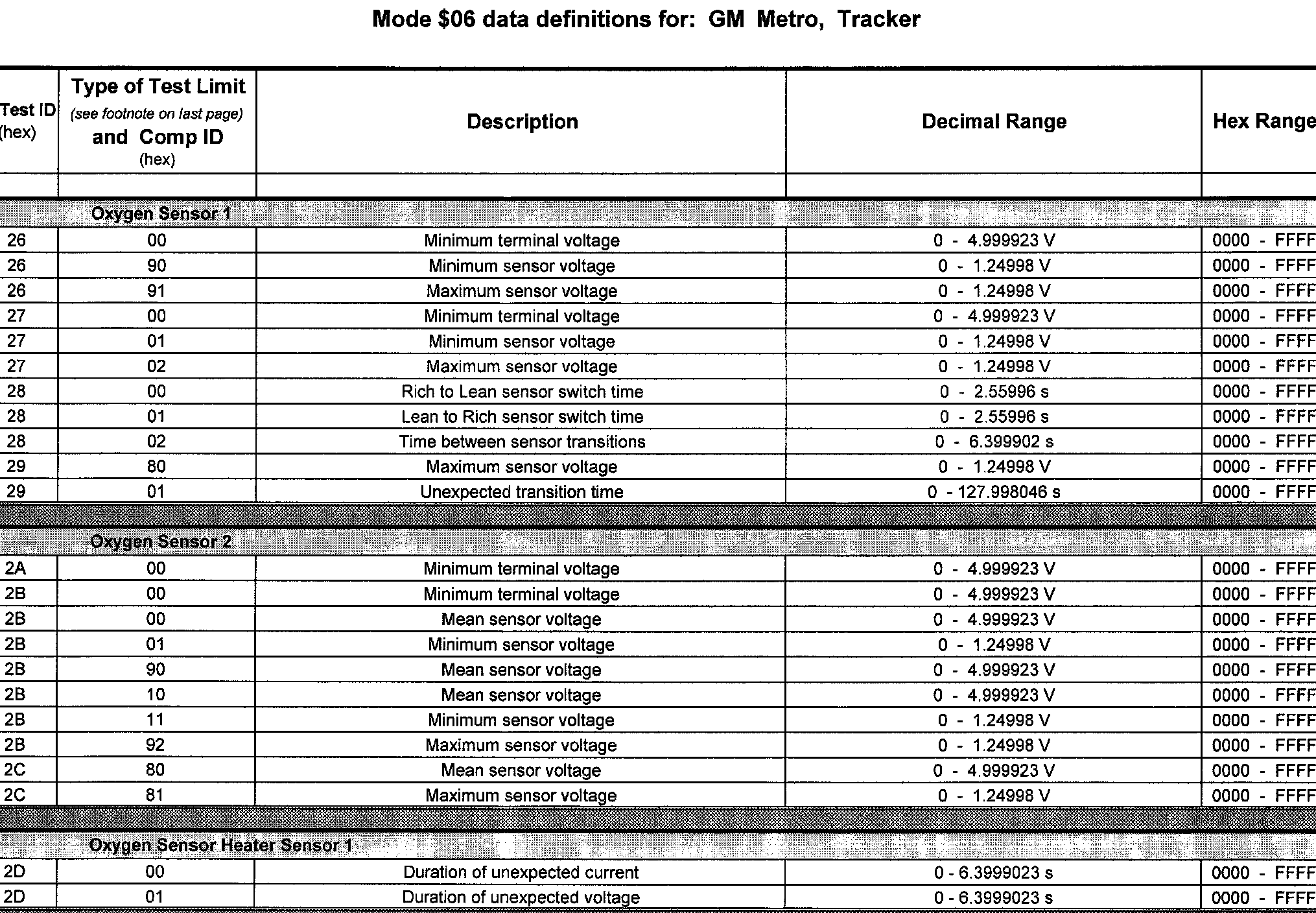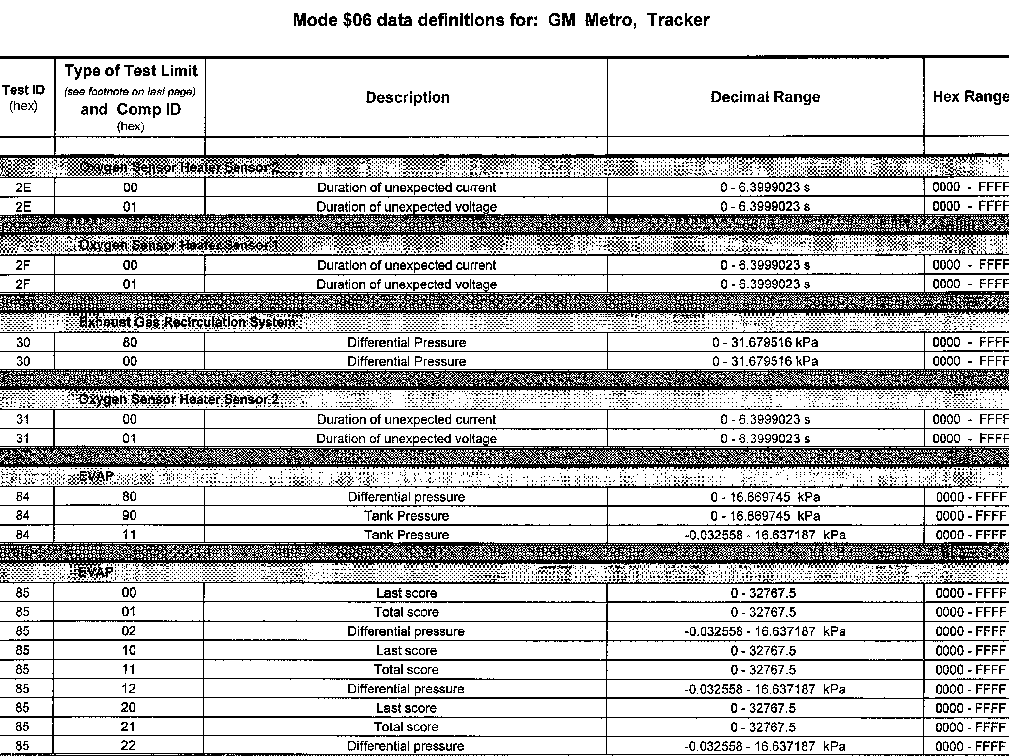 1999-2004 Chevrolet Metro/Tracker Mode 6 Data Description Page 1: