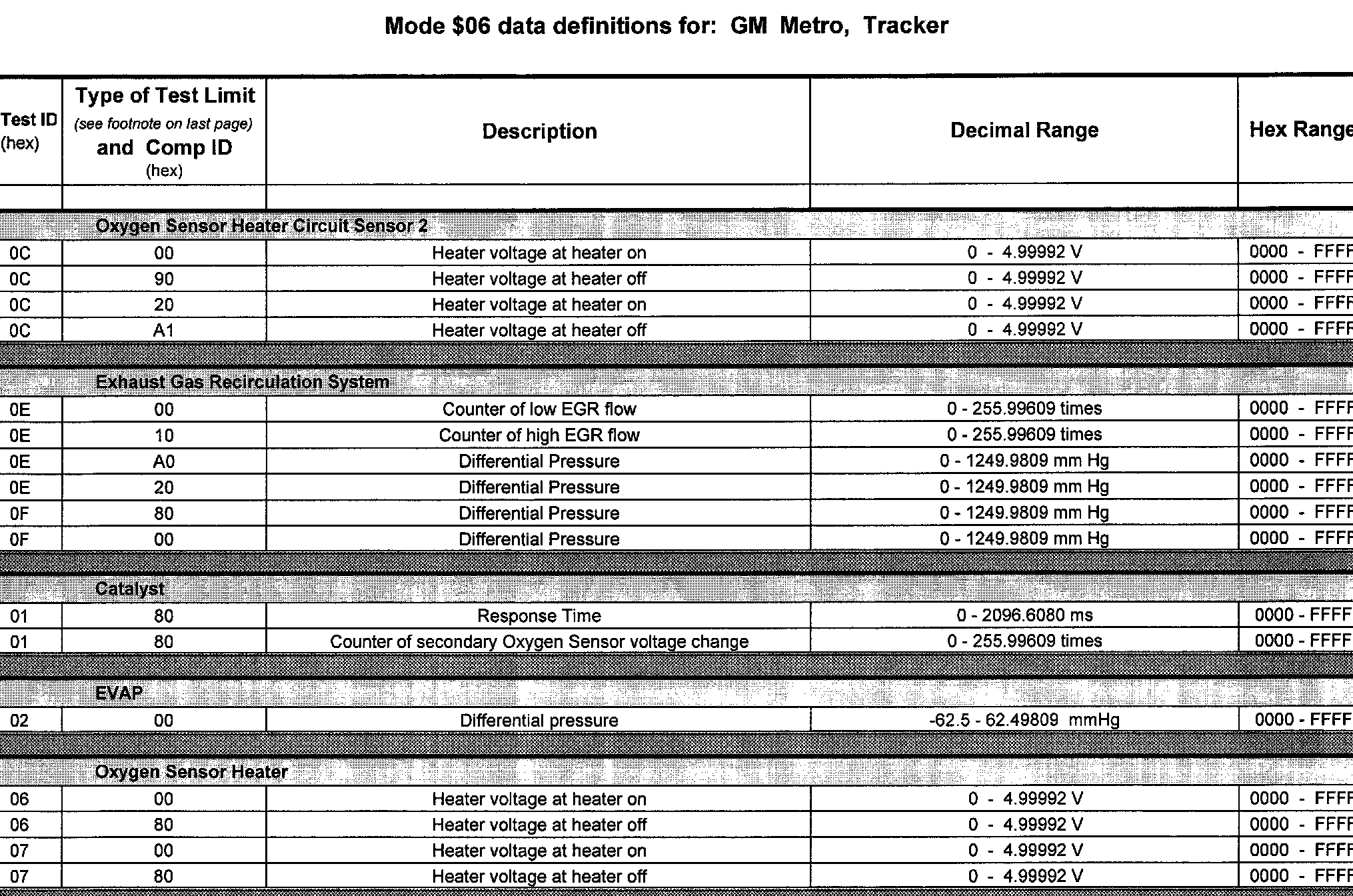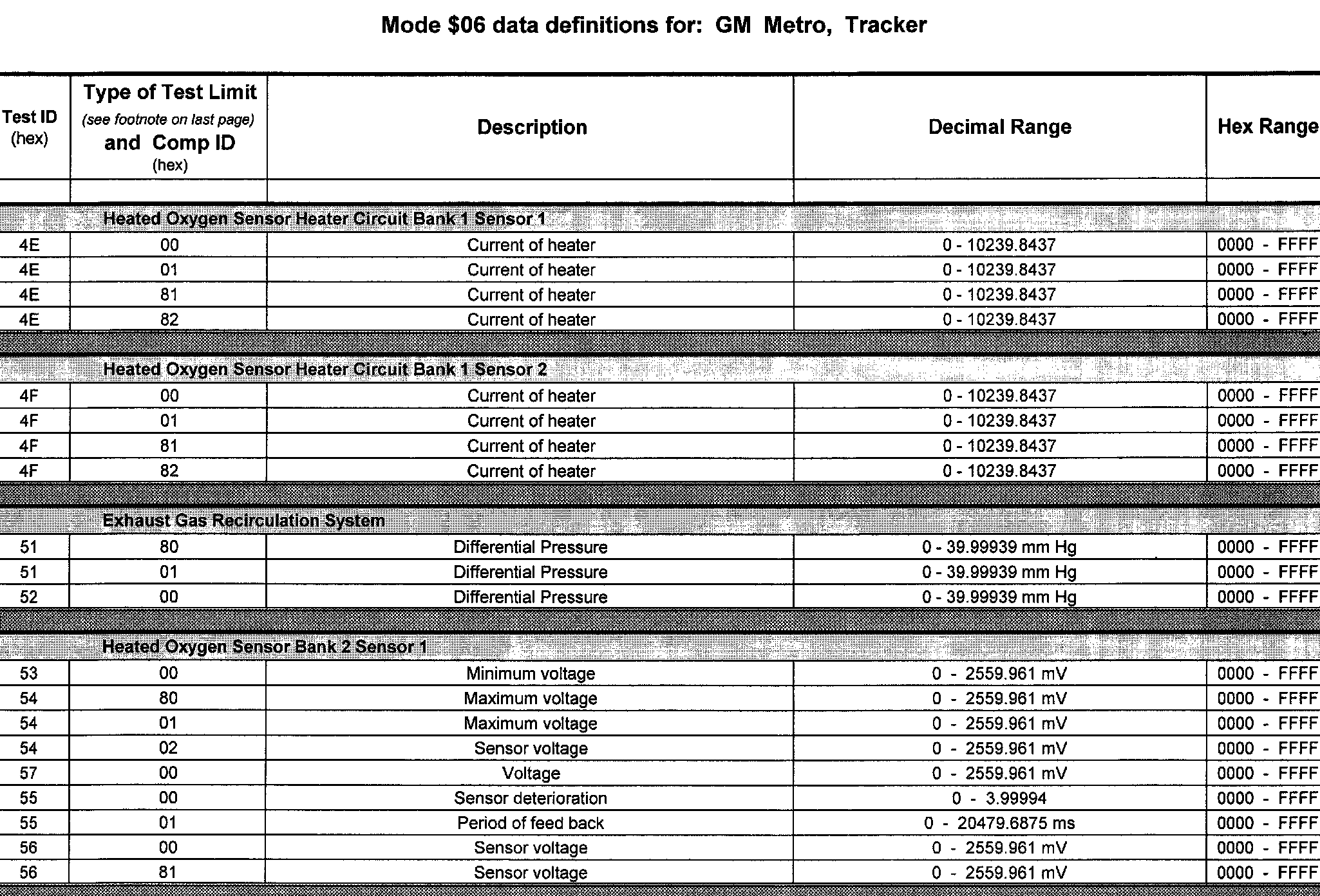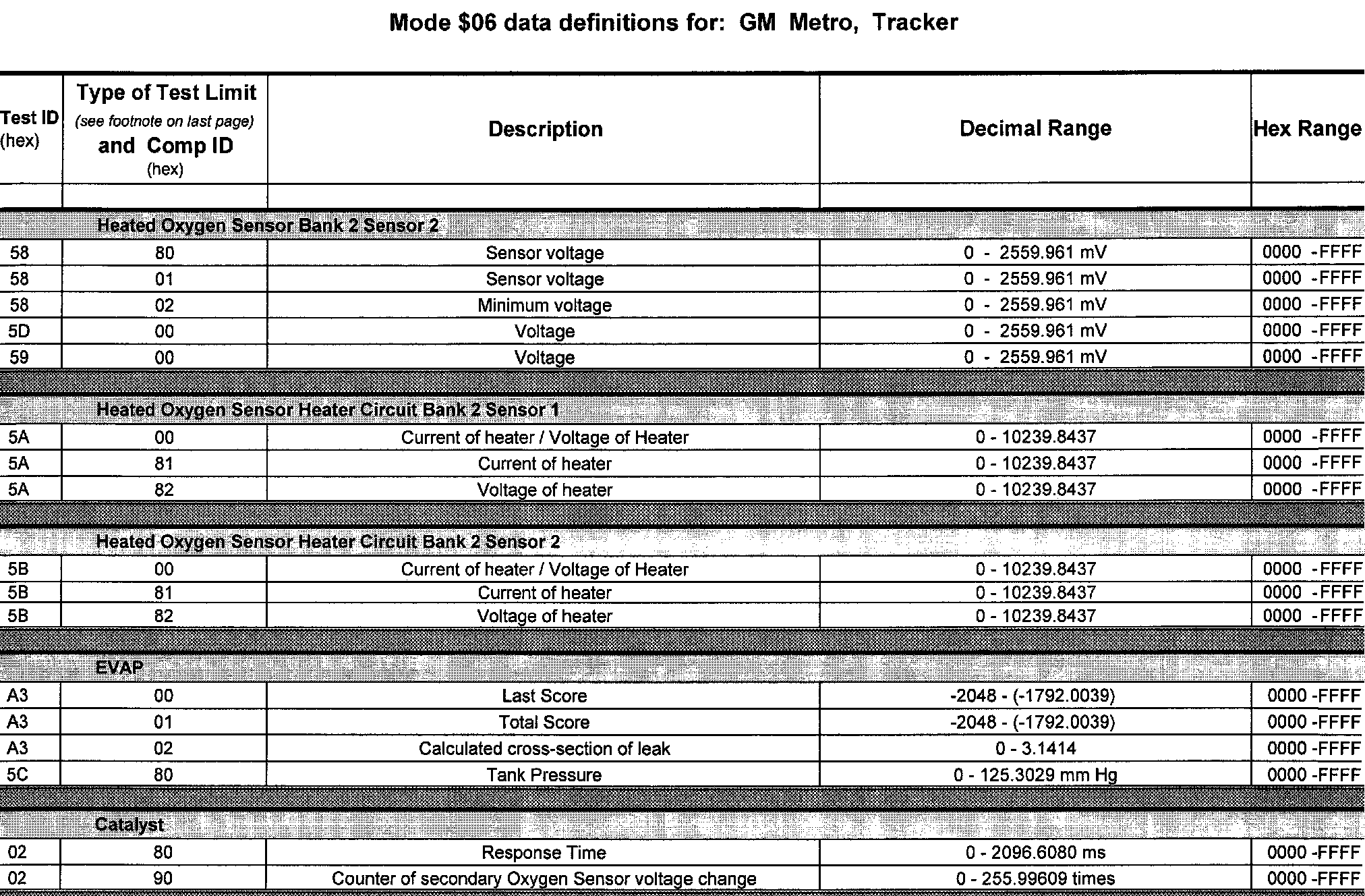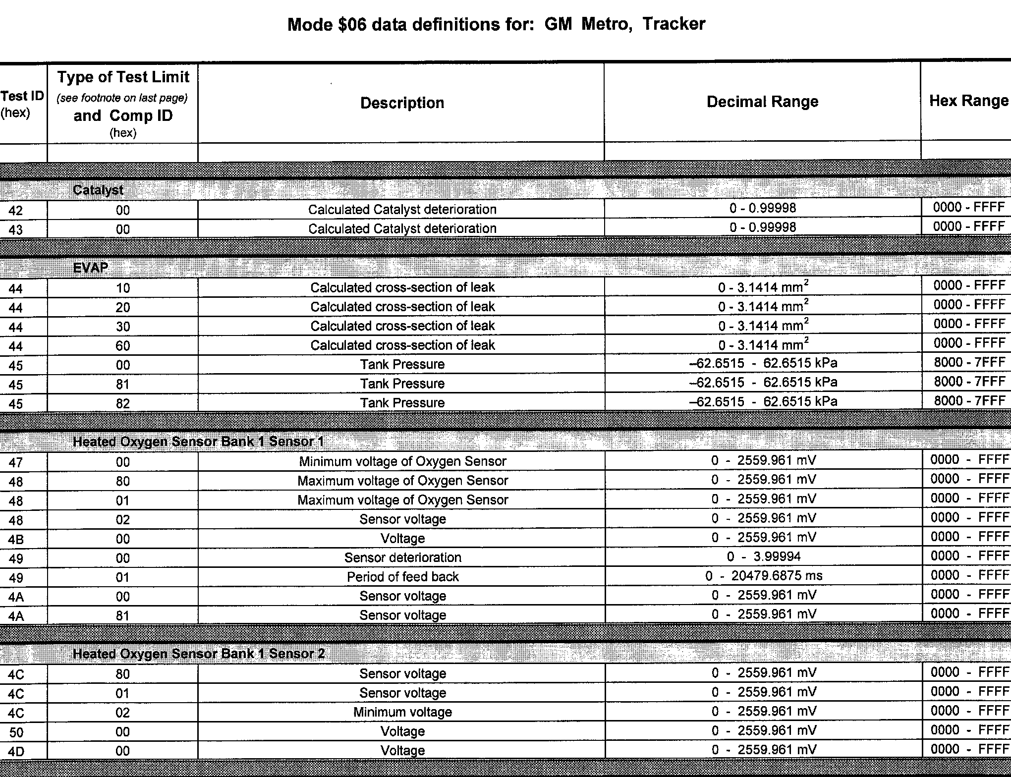 1999-2004 Chevrolet Metro/Tracker Mode 6 Data Description Page 1: