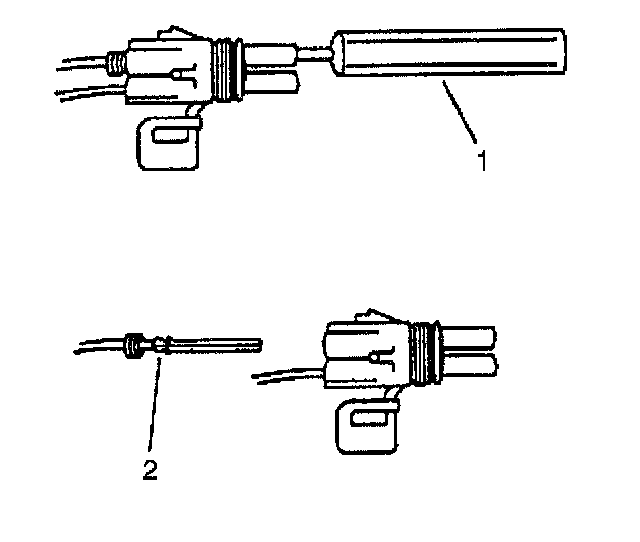 ^ Insert the Weather pack(R) terminal removal tool into the front (mating end) of the connector cavity until it rests on the cavity shoulder (1).