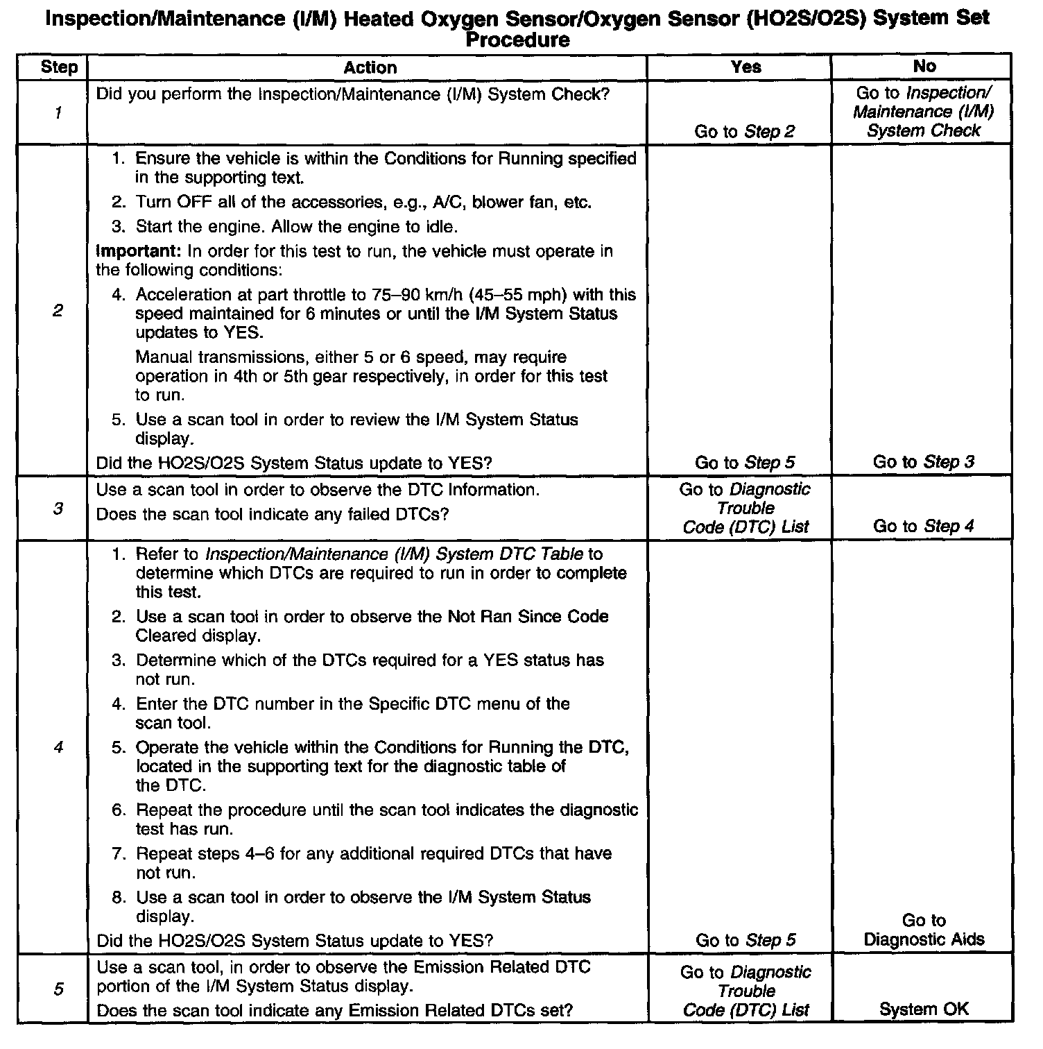 DESCRIPTIONThe purpose of this test is to satisfy the enable criteria necessary to execute I/M readiness diagnostics for the oxygen sensor (O2S, HO2S) system. The test may be used to set the I/M System Status to YES. Ensure the vehicle meets the requirements listed in Conditions for Running before performing this test. Failure to meet the necessary requirements may produce inaccurate test results.