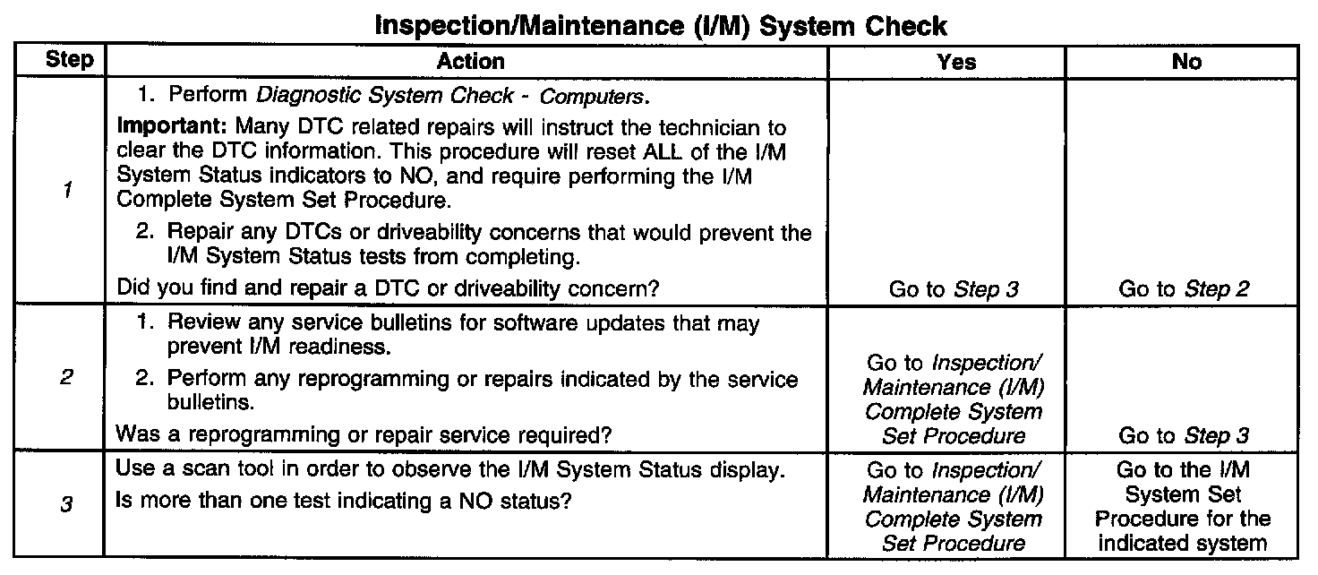 1. Any DTCs set, even those that are not listed in the Inspection/Maintenance System DTC Table, may prevent the required DTCs from running. If there is any question as to whether a set DTC is disabling the required I/M diagnostic, review the Conditions for Running in the diagnostic procedures for the DTC required by the I/M diagnostic. A list of disabling DTCs, if applicable, is contained in the supporting text for that DTC.