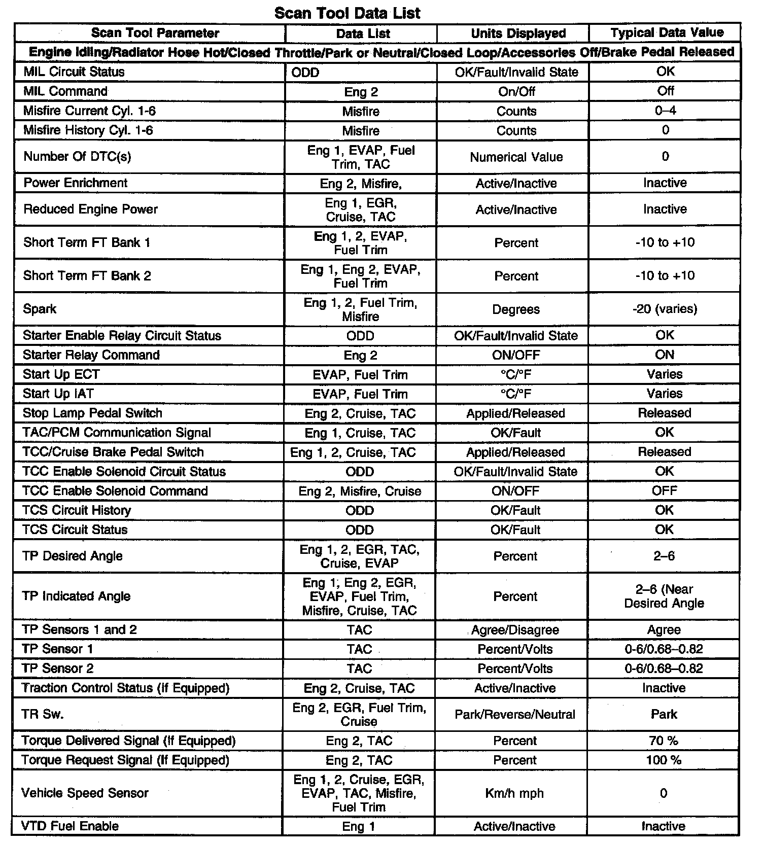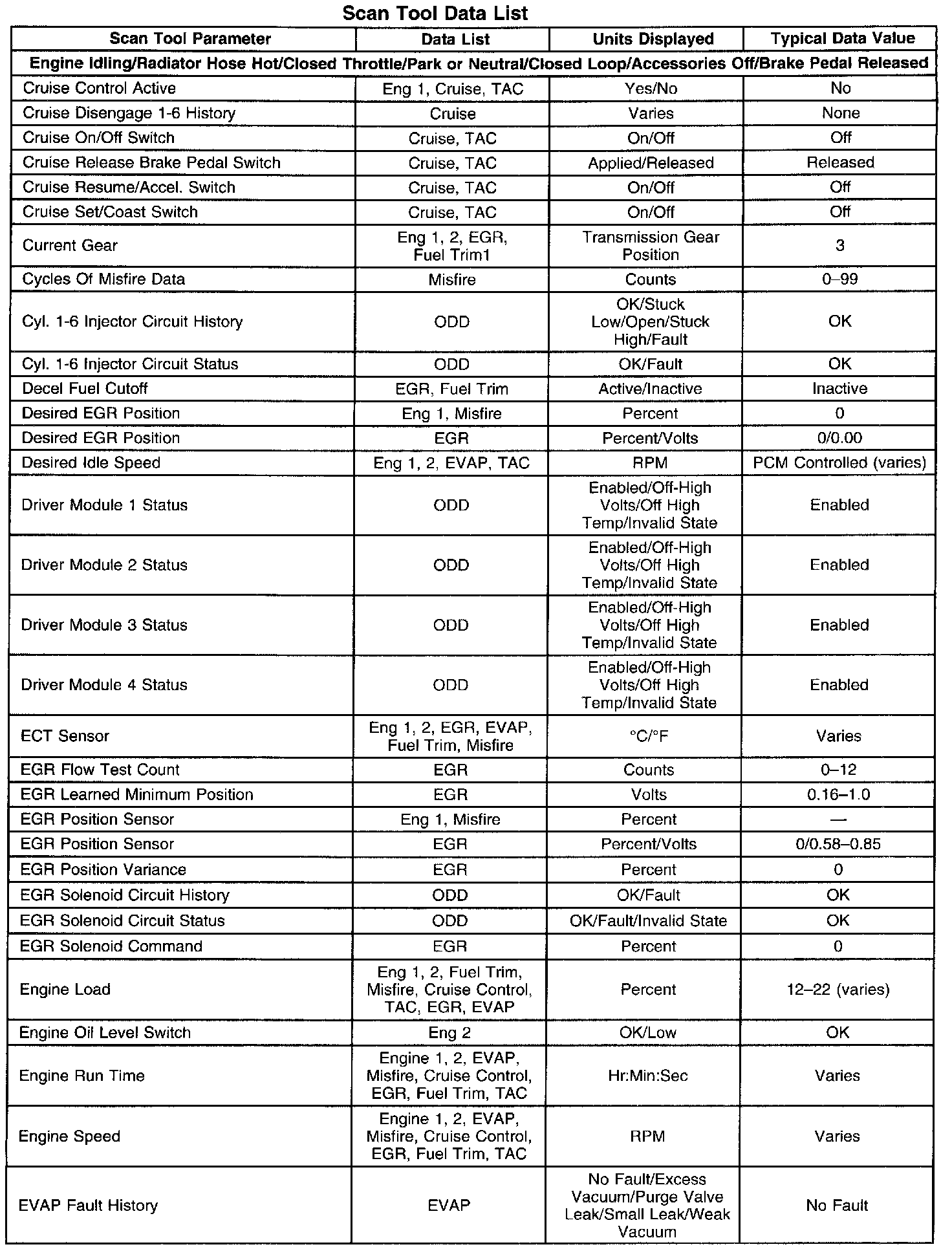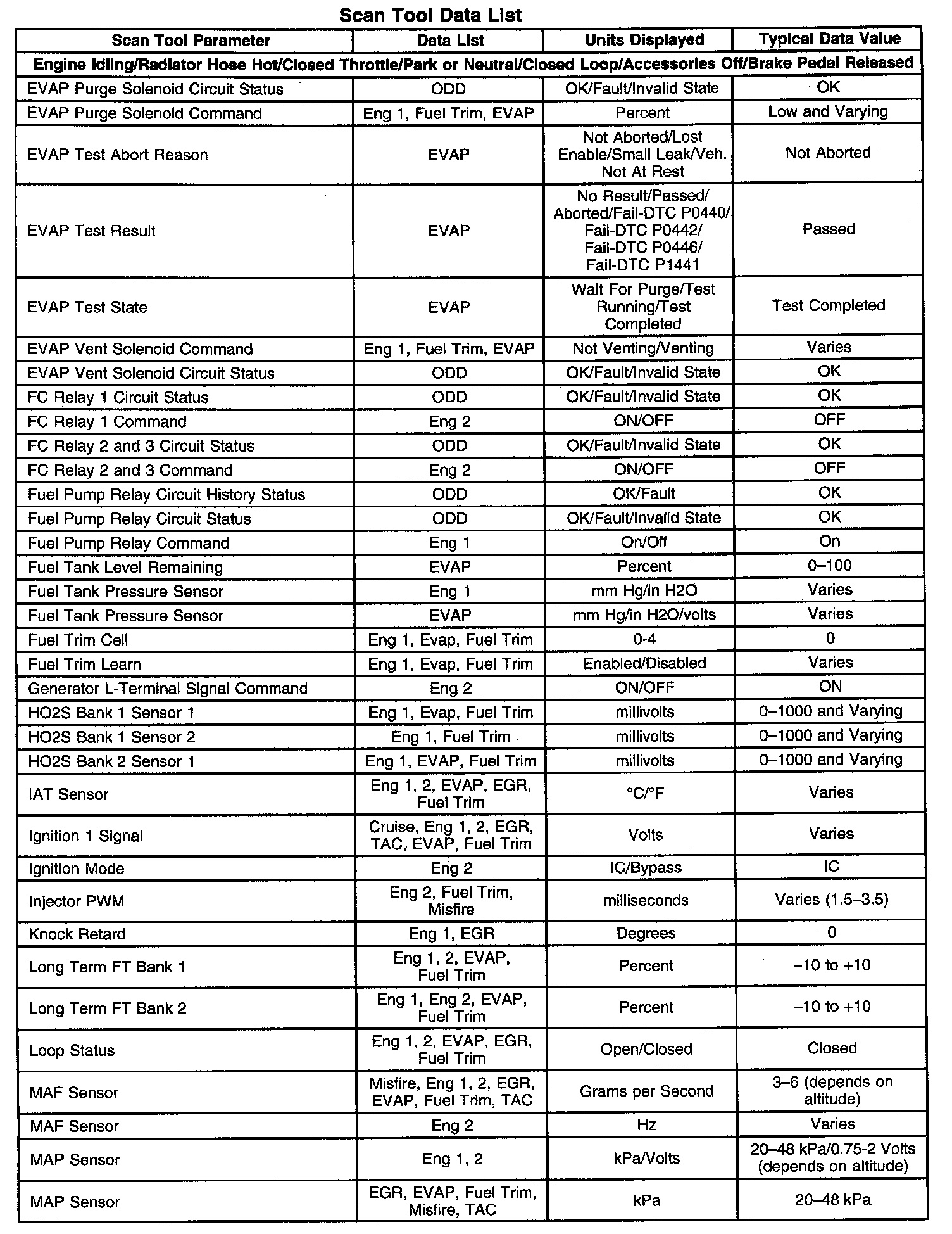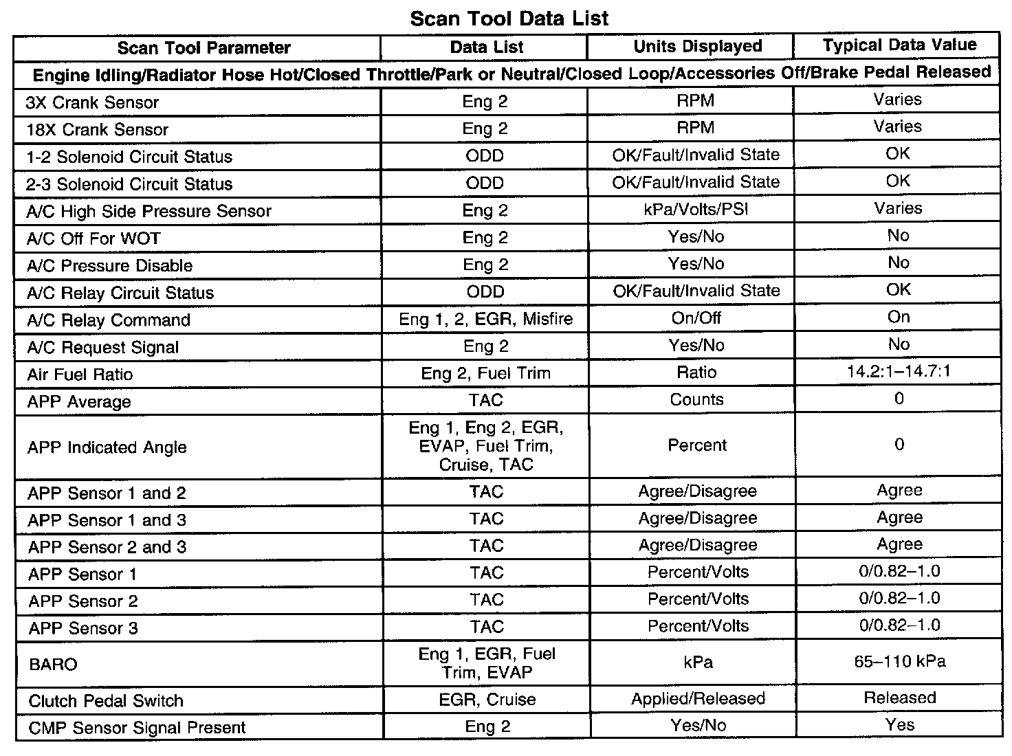 The Engine Scan Tool Data List contains all engine related parameters that are available on the scan tool. The list is arranged in alphabetical order. A given parameter may appear in any one of the data lists, and in some cases may appear more than once, or in more than one data list in order to group certain related parameters together.