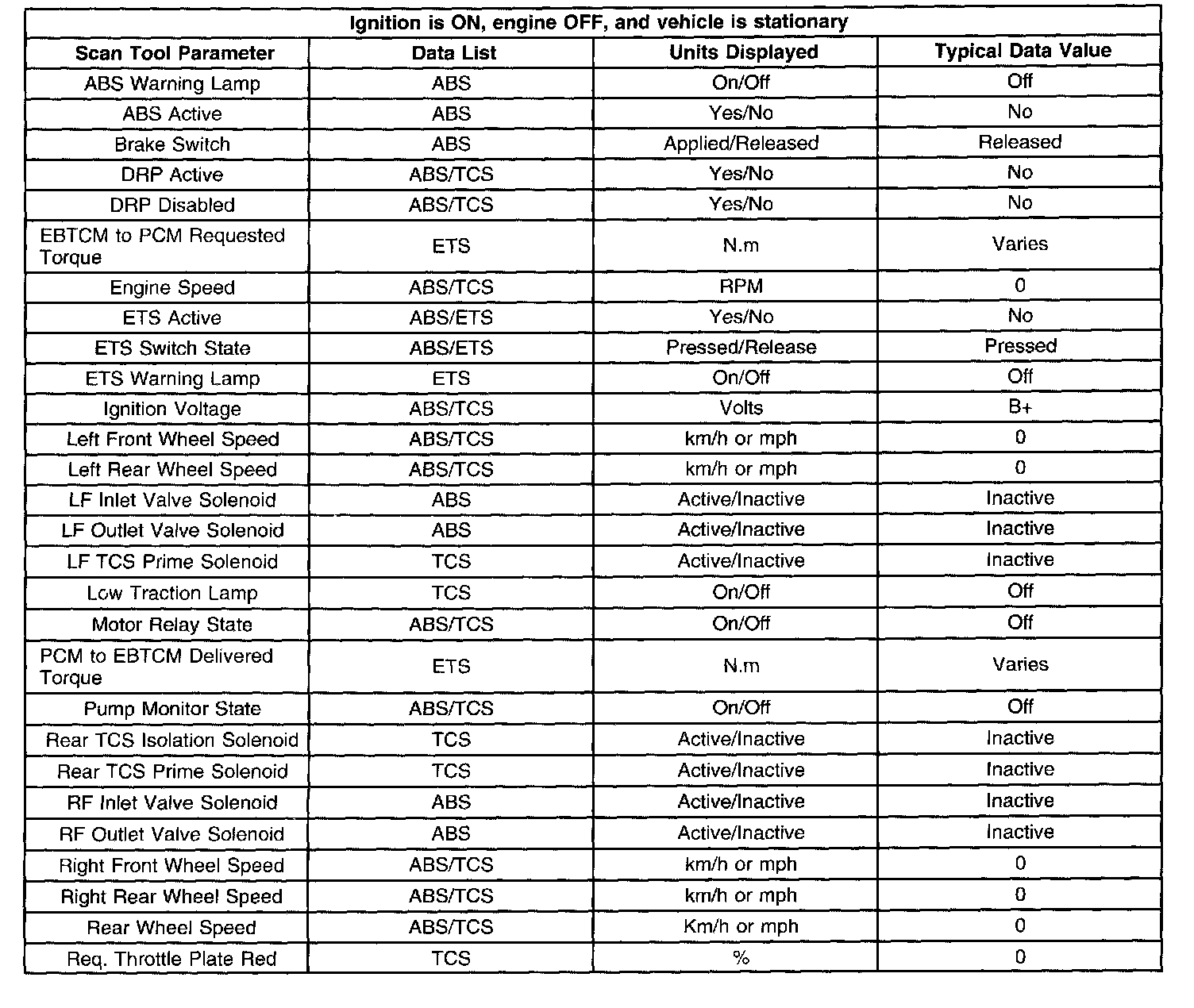 The EBCM Scan Tool Data Lists contain all the antilock brake system related parameters that are available on the scan tool. The parameters in the list are arranged in alphabetical order. The column, "Data List" indicates the location of the parameter within the scan tool menu selections.