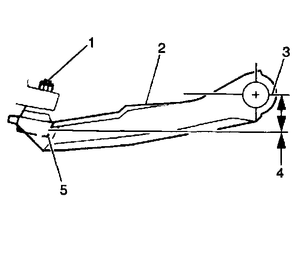 4. Measure from the pivot bolt center line (3) down to the lower corner of the lower ball joint (5), in order to obtain the Z height measurement (4).