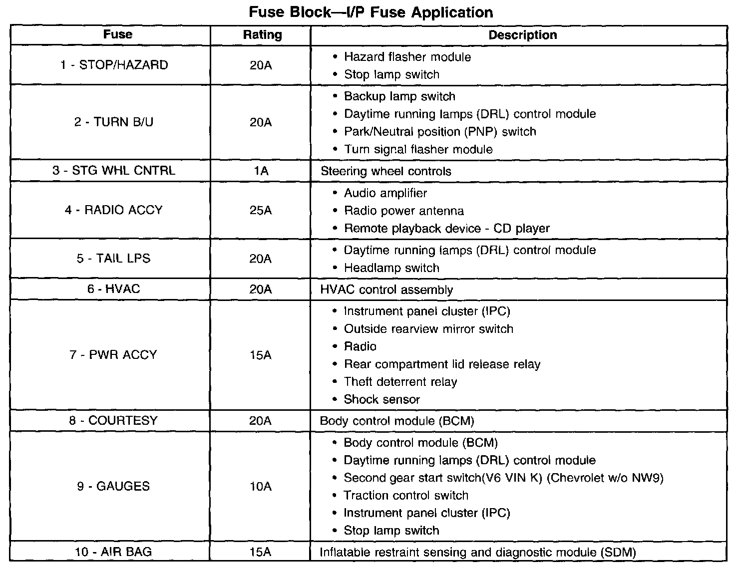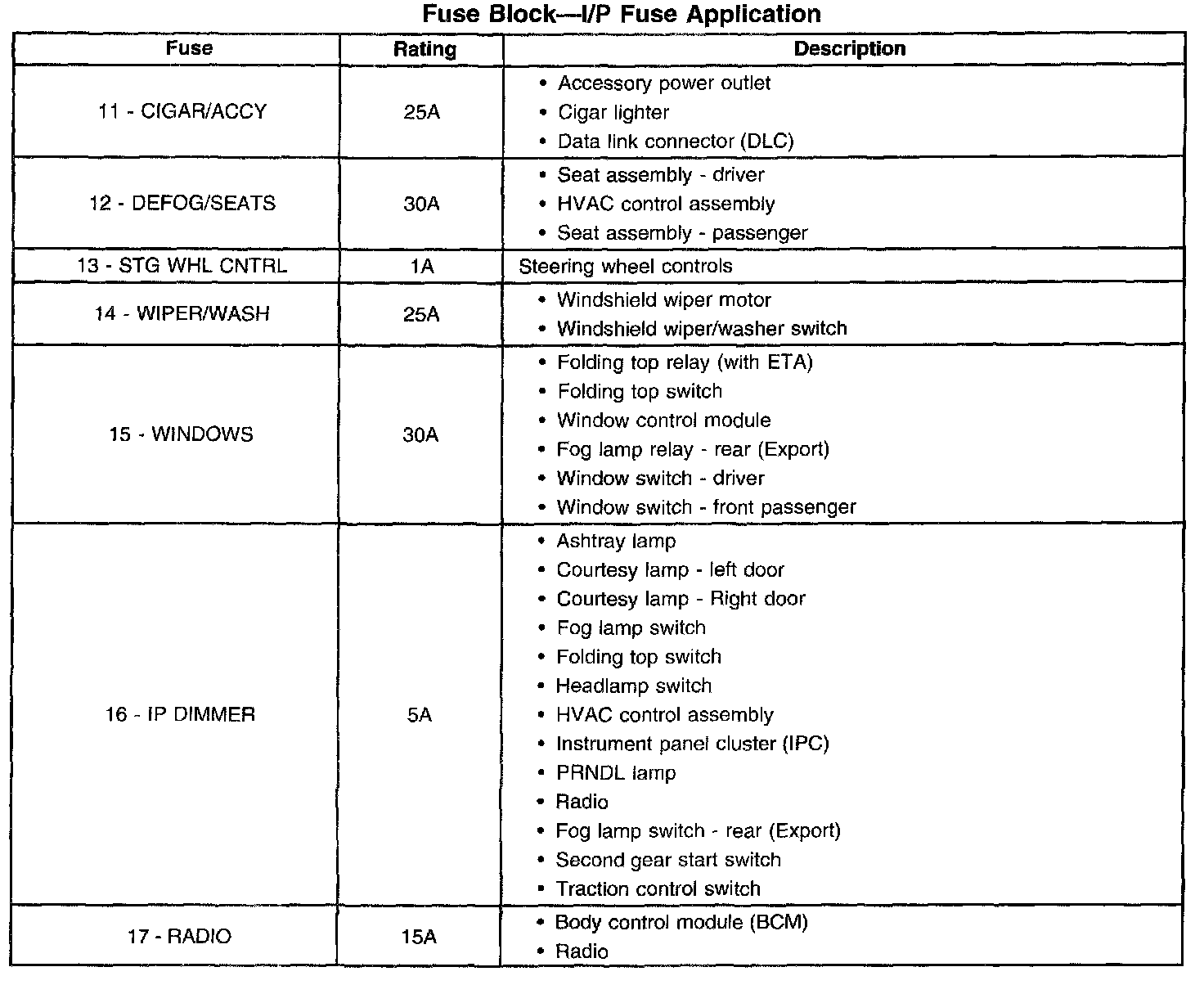 Fuse Block I/P Application Table