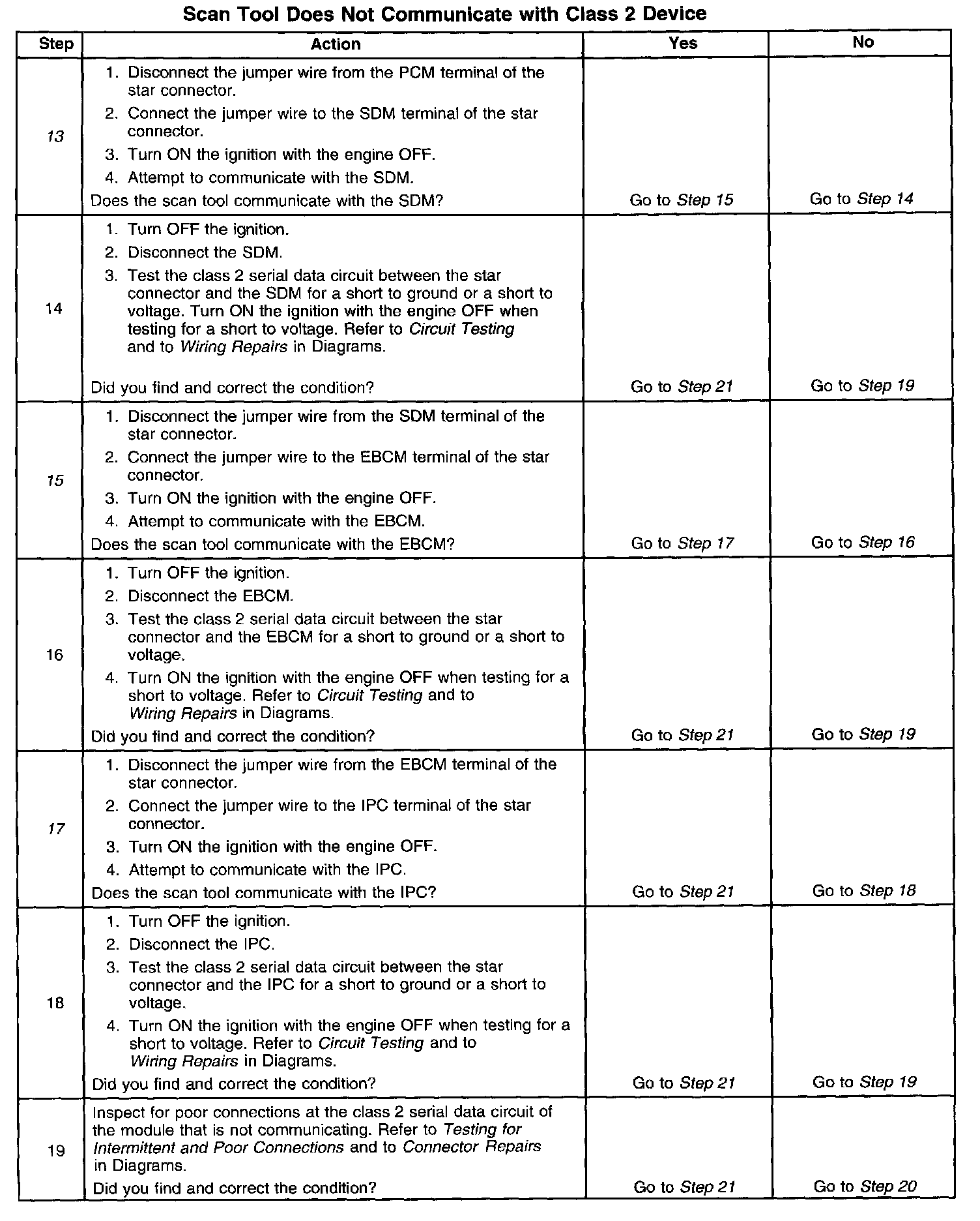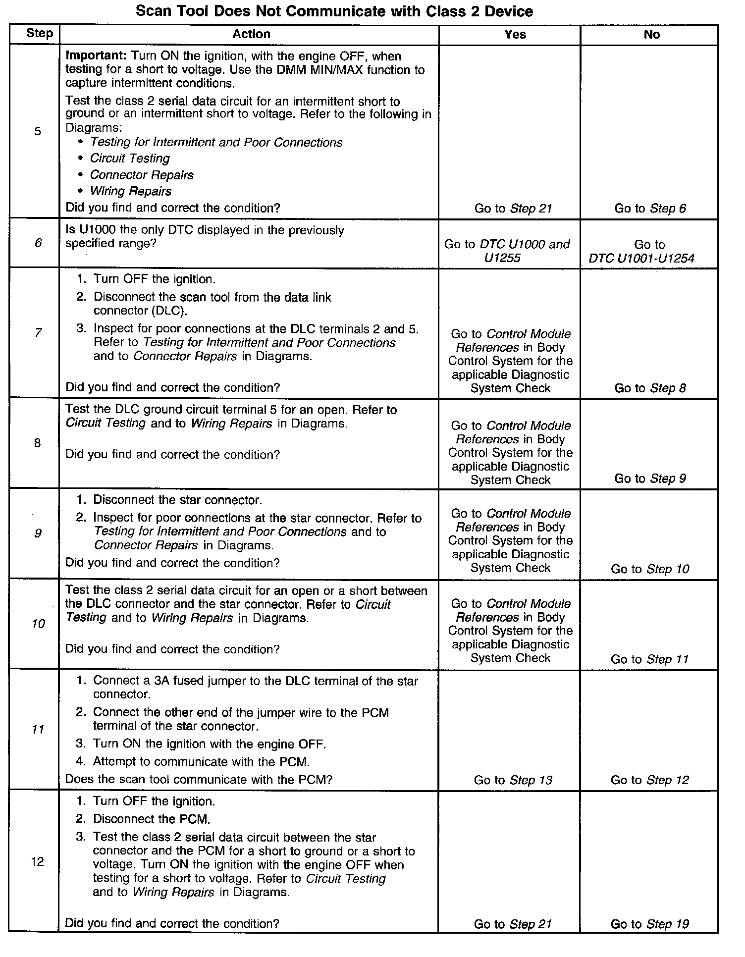 11. The class 2 serial data circuit is shorted to voltage or ground. The condition may be due to the wiring or due to a malfunction in one of the modules. When testing the wiring for a short, make sure there is not a module connected to the wire being tested. This test isolates the PCM class 2 serial data circuit.