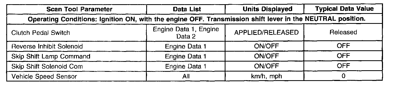 Transmission Scan Tool Data ListThe Transmission Scan Tool Data List contains manual transmission related parameters that are available on the scan tool. The list is arranged in alphabetical order. The parameters in the Typical Scan Data values column represent values that would be seen on a normally running engine.