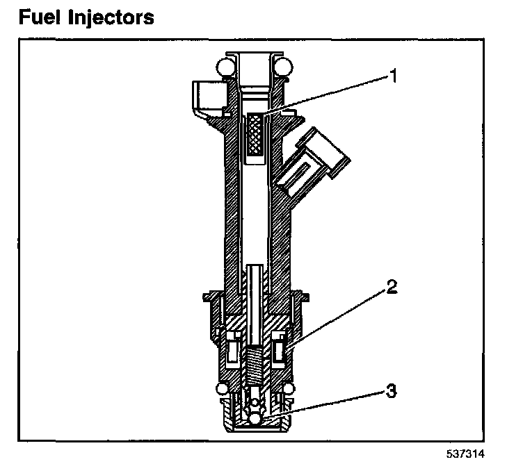 The Multec 2 fuel injector assembly is a solenoid operated device, controlled by the PCM, that meters pressurized fuel to a single engine cylinder. The PCM energizes the high-impedance (12.0 ohms) injector solenoid (2) to open a normally closed ball valve (3). This allows fuel to flow into the top of the injector, past the ball valve, and through a director plate at the injector outlet.