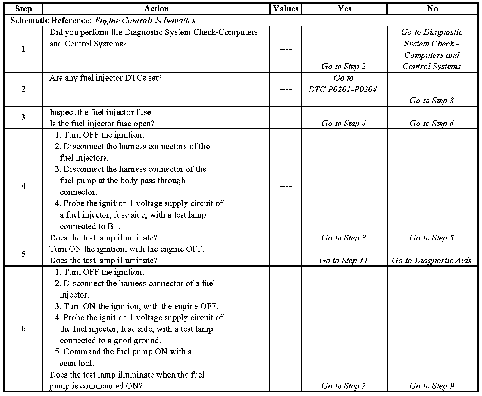 Fuel Injector Circuit Diagnosis - Steps 1-6: