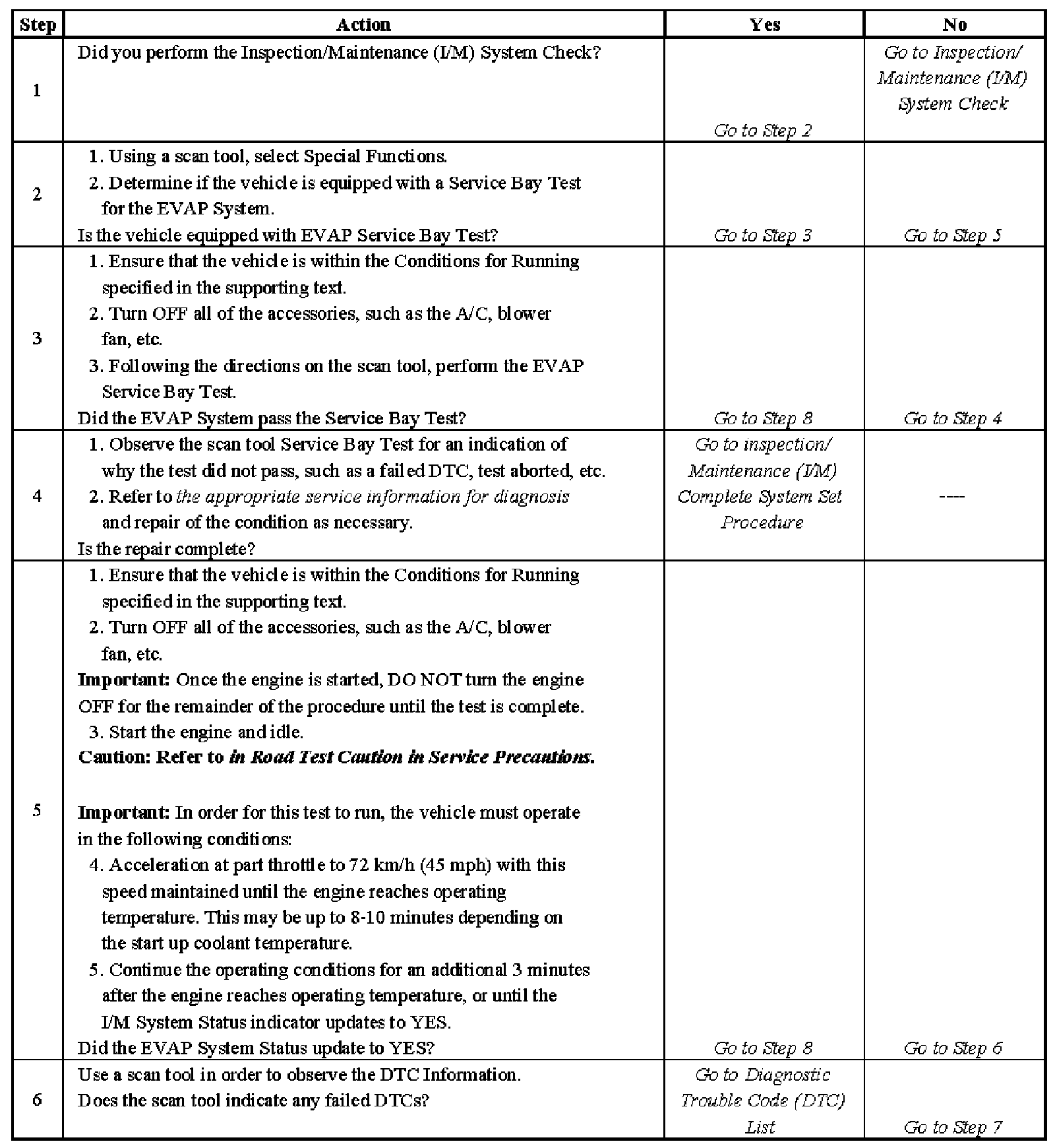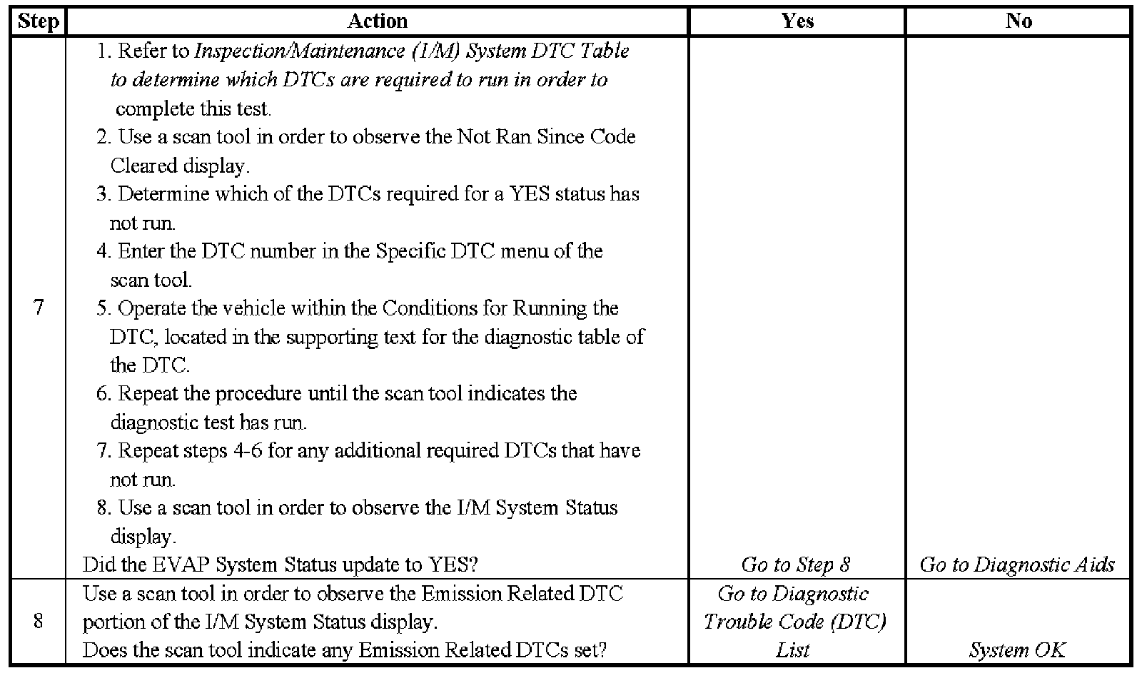 6. This step identifies a first failure of a type B DTC. A DTC only appears on the I/M System Status display when the DTC becomes a MIL illuminating DTC. This occurs on the second failure of a type B DTC. A first failure of a type B DTC will not allow the I/M System Status to update to YES. Refer to Diagnostic Aids.