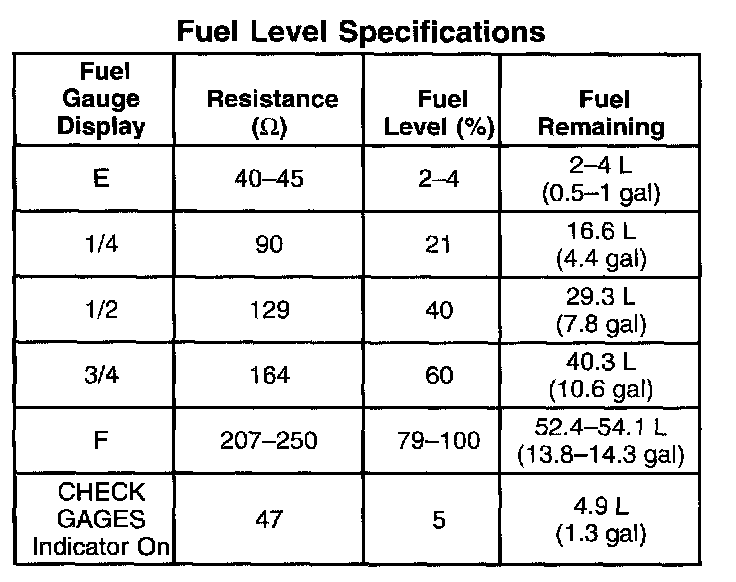 The values in the table are approximate values based on information obtained from properly operating vehicles. Actual results may vary slightly.