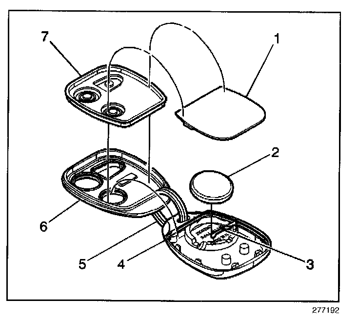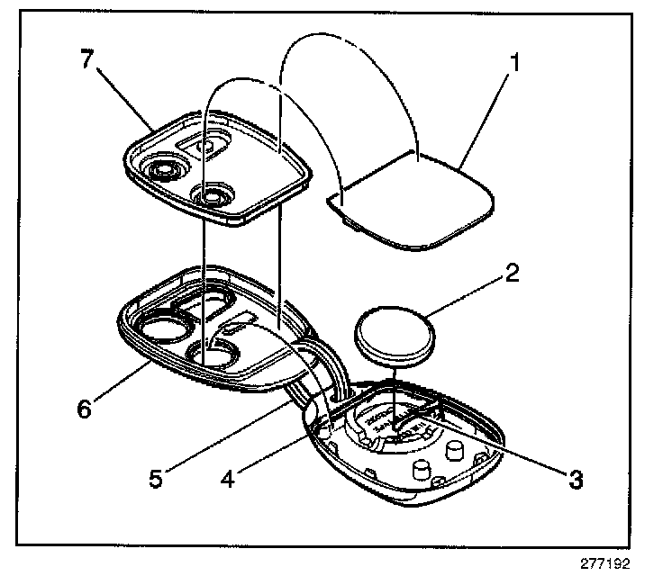 1. Insert a small flat-bladed tool between the 2 halves of the transmitter case (6,4) at the slot provided near the key ring (5) hole.