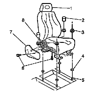 1. Position the driver or the passenger front bucket seat forward or rearward in order to gain access to the seat adjuster attaching nuts (3).